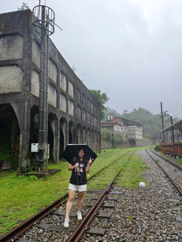 ▼口咩身後這座是舊時的選洗煤場,現場只留下空蕩蕩的幾根柱子,搭配陰鬱的雨天更顯得蕭條寧靜。