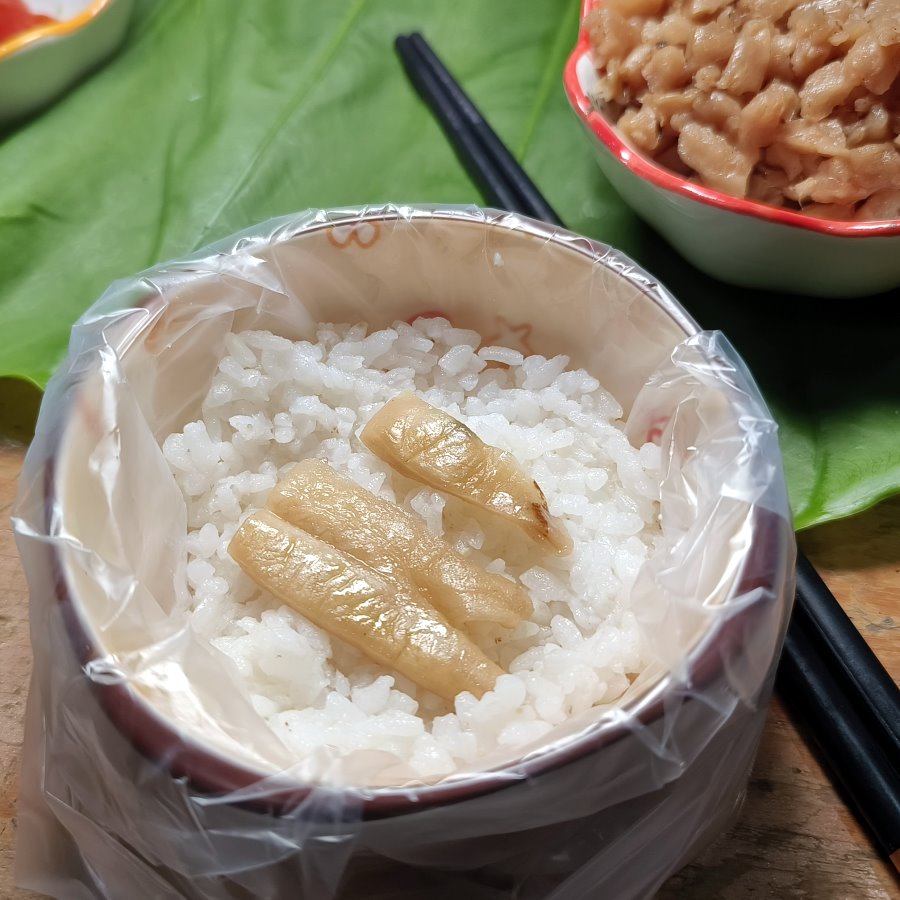▼當年的礦工飯糰就是一堆白米飯,夾著三條蘿蔔乾,雖然只有這樣但大家還是幾口就吃光光,在當時能填飽肚子繼續上工才是最重要的事情。