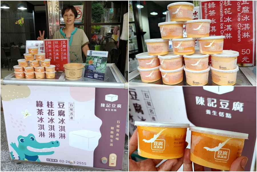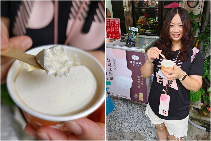 ▼一旁的陳記豆腐冰淇淋也很有特色,老闆回鄉偶然吃到小時候記憶中那股帶有焦香的豆腐,便發揮創意將石碇豆腐以簡單的方式化身為各種甜點,除了可以吃到豆腐的原始風味之外,也沒有多餘的添加,更能突顯豆腐的鮮度與美味。