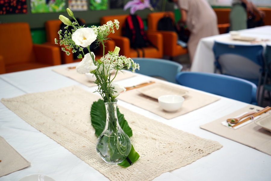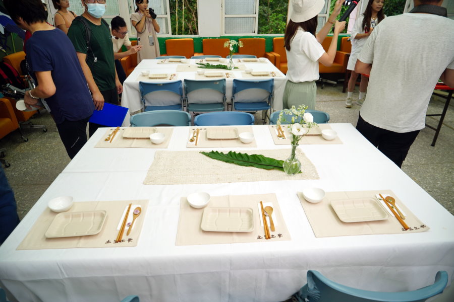 ▼餐桌以花藝擺飾,加上以紙纖維製成、可多次使用的餐盒及餐具,典雅好看又不會造成環境的負擔。