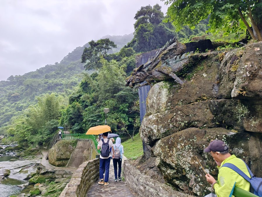 ▼右側高大牆面上還可以看見由石碇在地藝術家楊敏郎先生所創作的巨幅作品「龍蟠巨石護河川」,會先看見飛龍的頭部,再往前走則會看見靈巧穿越石壁中的龍尾,搭配壯闊的石壁真的很壯觀啊!