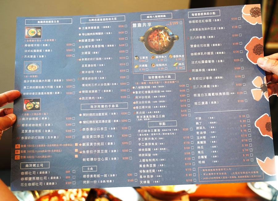 餐點樣式多,可以從早午餐、南洋咖哩、鍋物、烤土司等等美食都能滿足到