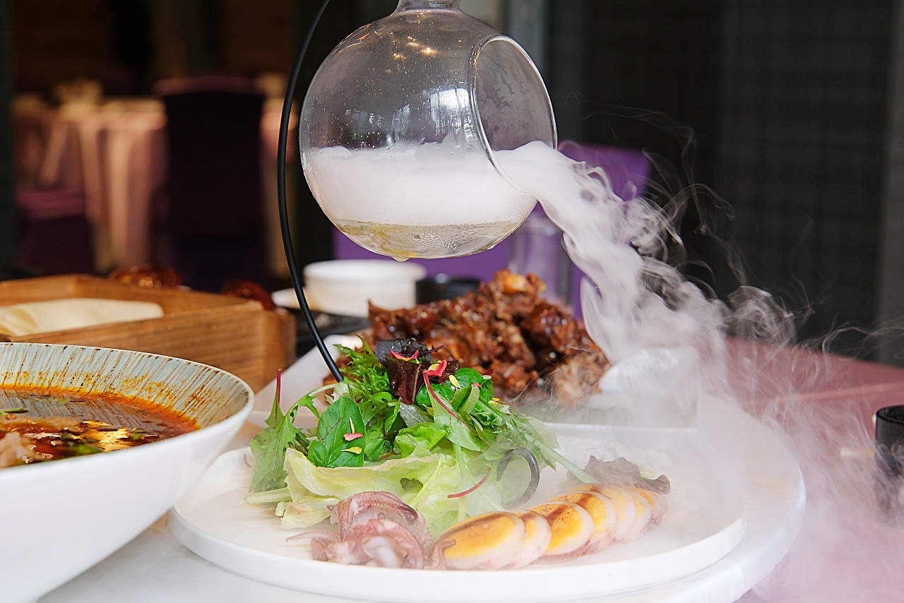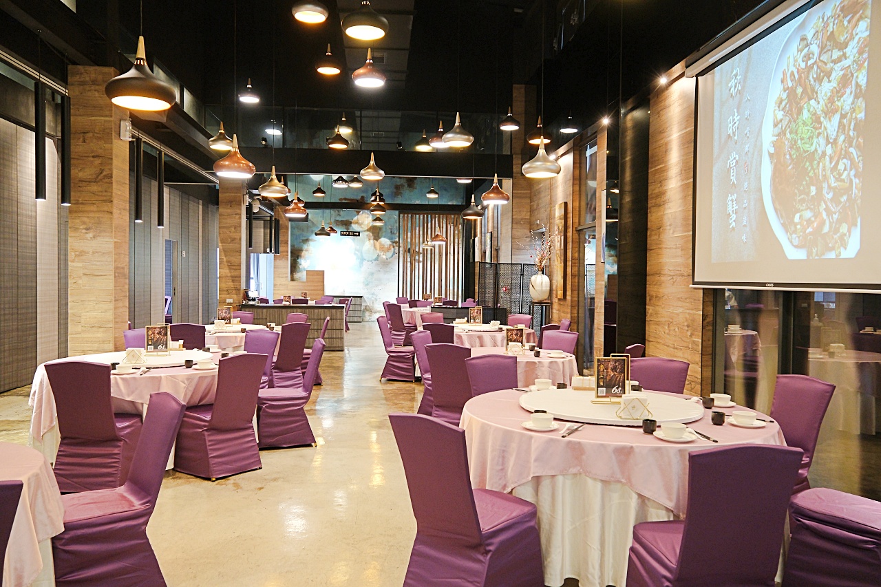 室內空間寬敞,以紫色系桌椅套配色跟造型吊燈,讓整體空間更顯時尚高雅。餐點菜色主打創意組合,以江浙菜為基底融入日本懷石料理製作精神,揉合法式料理的趣味與創意擺盤,把中西料理手法打造成全新亞洲風格。