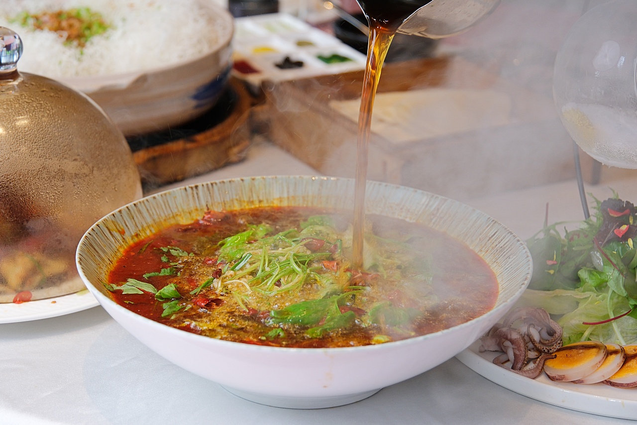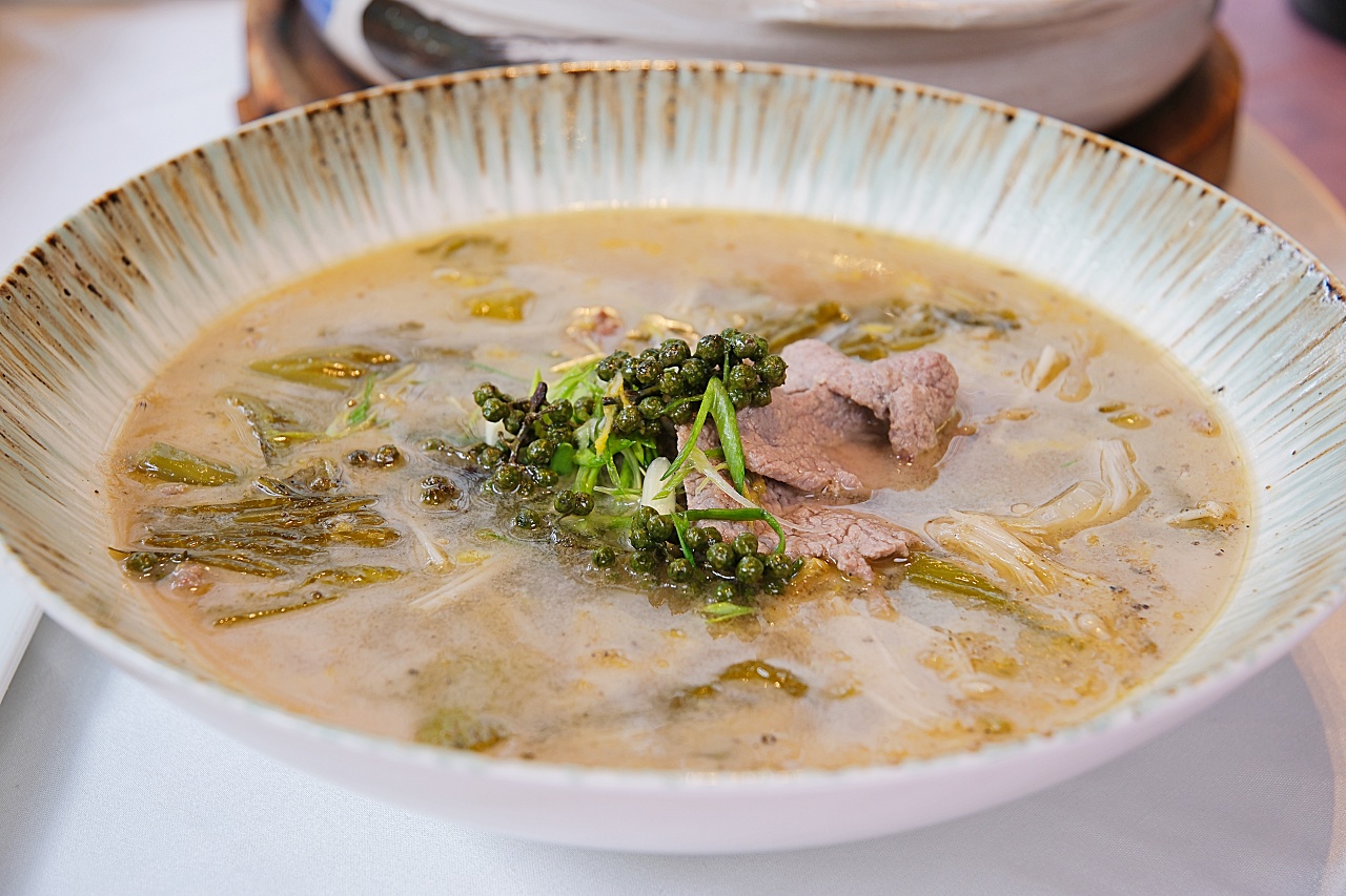 以開胃的酸湯為底加入牛肉片、金針菇、酸菜、青花椒、雞白湯一起熬煮,起鍋前再淋上白醋,酸香夠味。