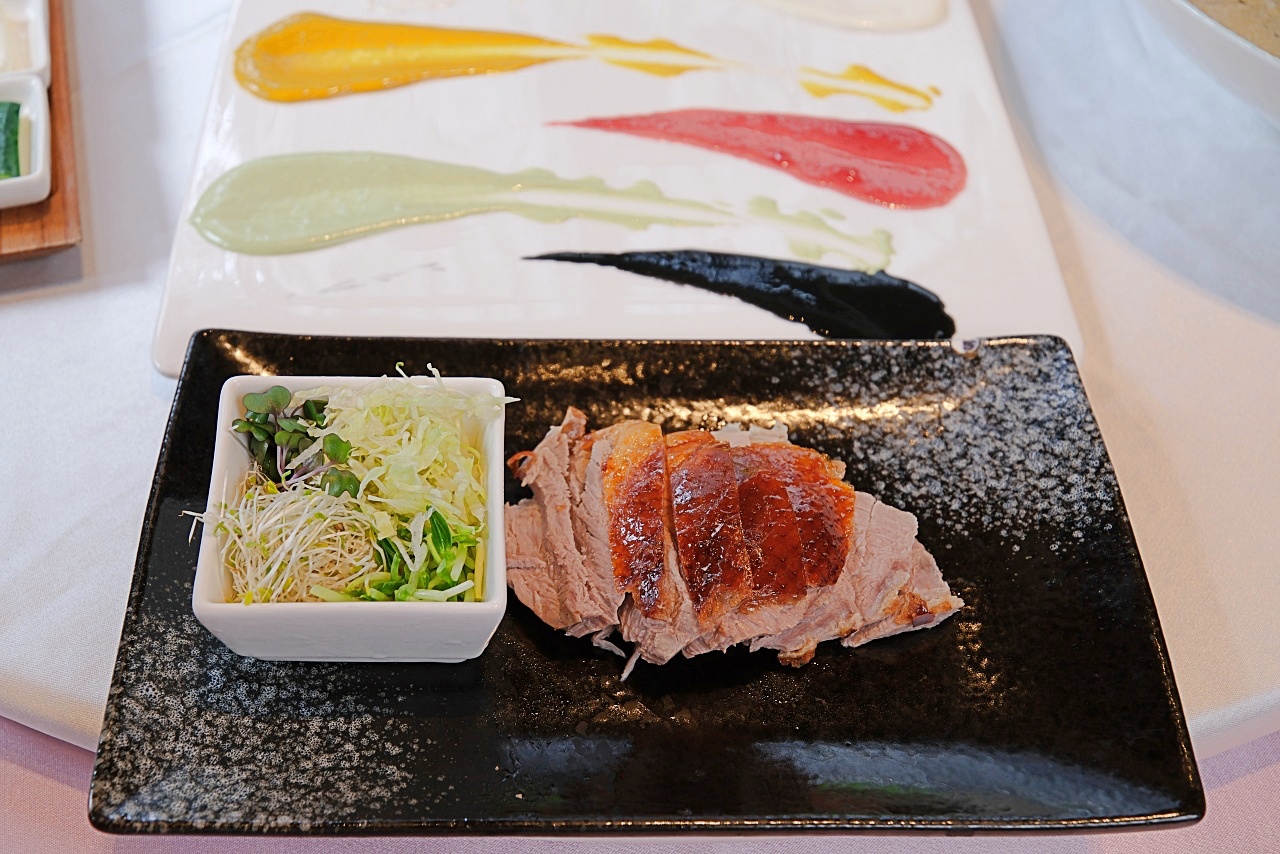 在白色瓷盤上隨性刷上六種特調醬料,有著法式餐點的靈魂。片了鴨胸菲力,用荷葉餅捲上水耕生菜,沾上特色醬汁,很有趣的吃法。