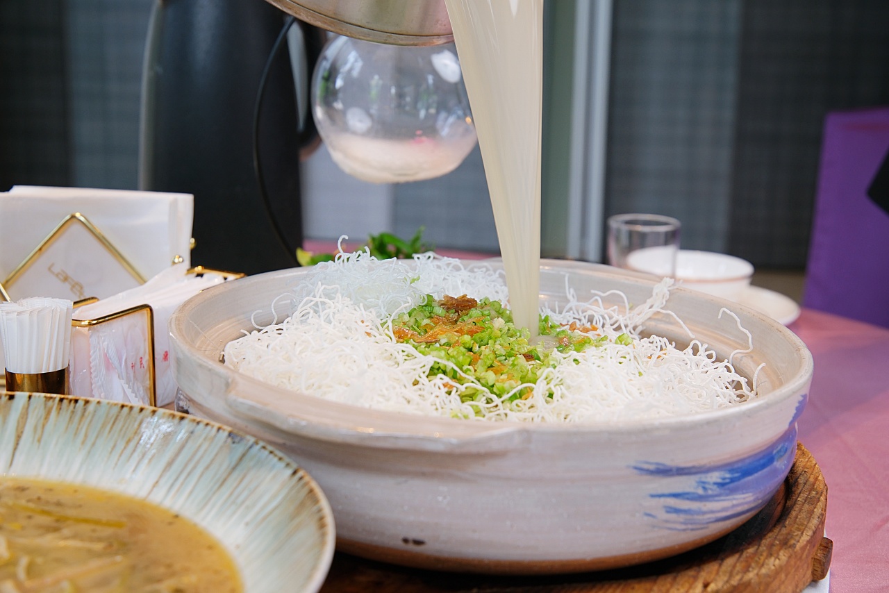 把新竹米粉再酥炸過,變成香香脆脆口感,加上爆炒的五花跟蒜頭、軟綿入口即化的芋頭,端上桌的時候還是乾的,會有專人桌邊淋上老母雞高湯,撒上蔥酥、芹菜提香,再倒入芋頭泥,口感不軟爛,湯頭清甜不膩。