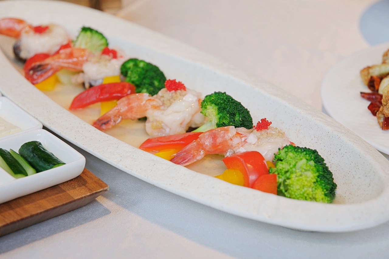 草蝦裹覆蝦漿、馬蹄、芹菜、家鄉肉末,用簡單的清蒸方式料理,最後點綴上飛魚卵。