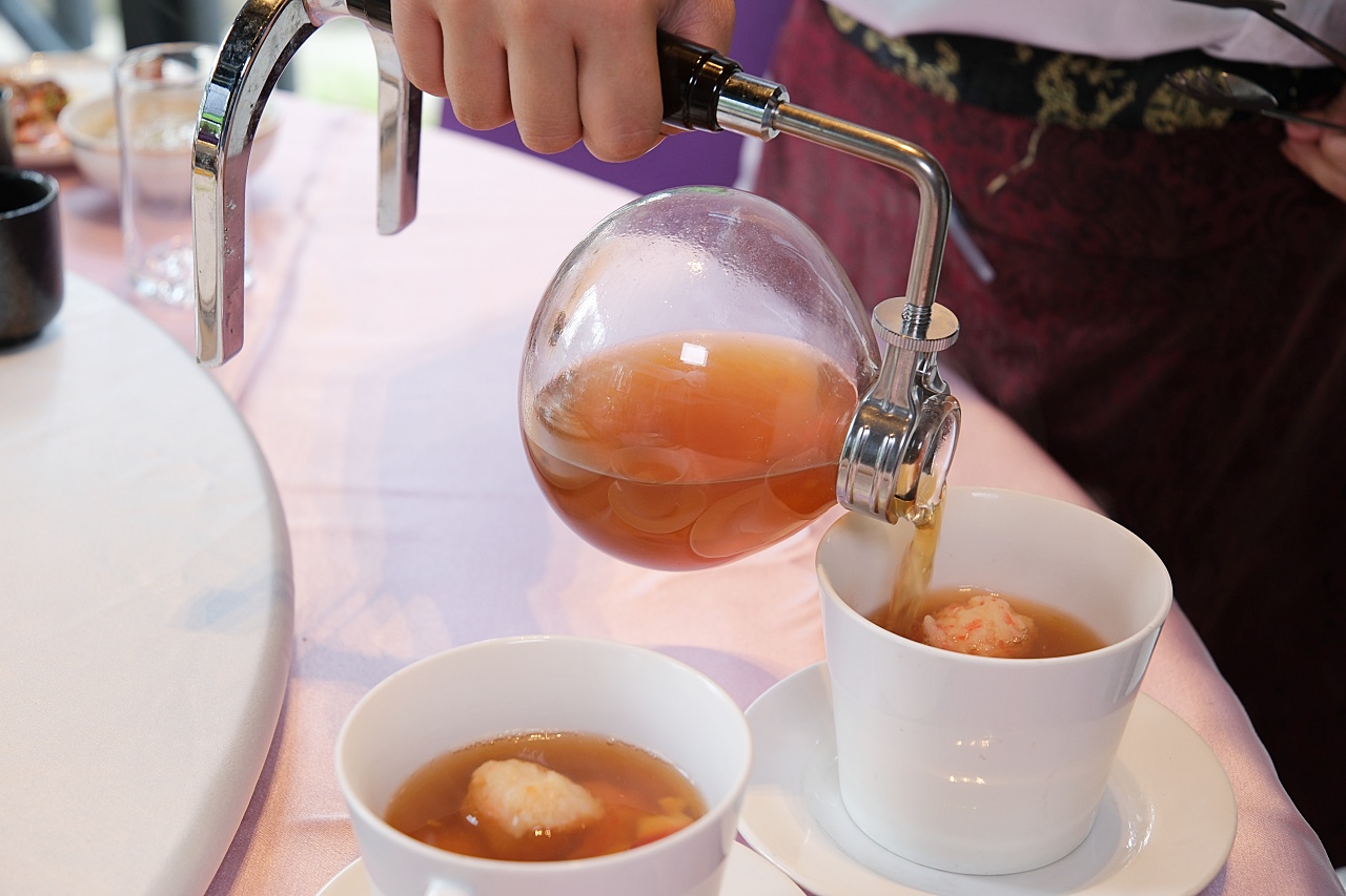 把蝦丸、花枝丸、蟹肉丸、蘭花蚌、柴魚高湯凍(以蛤蠣調味)、干貝、豆腐(盛裝於湯杯)組合一起,用虹吸萃取來煮海鮮濃湯,湯頭濃郁,滿足視覺跟味覺。