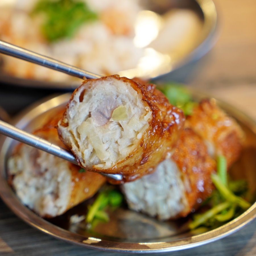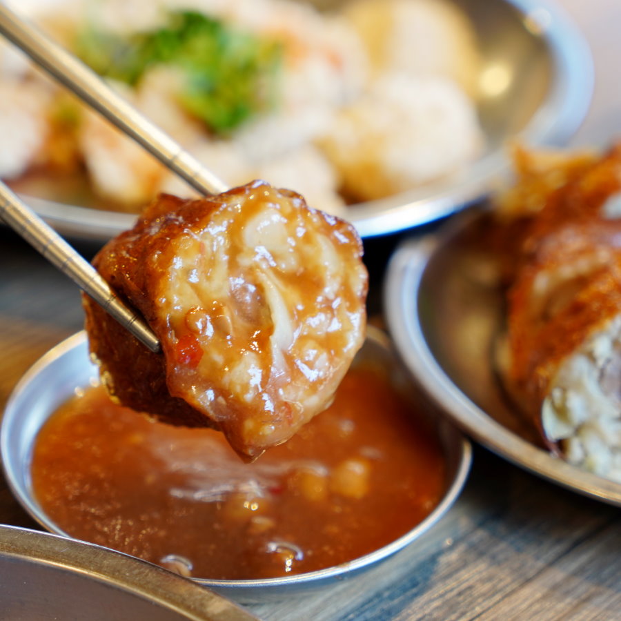 ▼外皮帶點討喜的琥珀色澤,薄酥又沒有過多的油膩感,一口咬下,既能吃到紮實的豬肉塊,還有甘甜多汁的洋蔥、爽脆的荸薺與鮮美魚漿,吃起來完全沒有油耗味或豬癬味,入口鬆軟卻不鬆散,味道非常和諧美味,我們也立刻包了一份回家給家人享用。