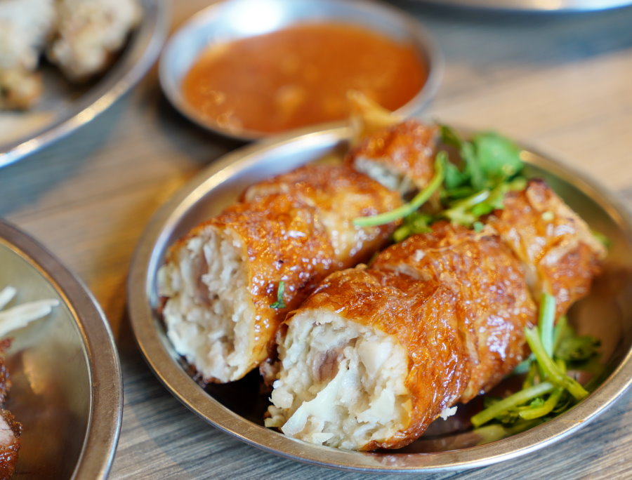 ▼馬薺脆雞捲,店家自製的雞捲,從洋蔥就開始講究,不僅要視季節挑選出適合的進口洋蔥品種手剝而成,才不會因水分過多容易鬆散;加入新鮮魚漿、豬肉、荸薺等手工包裹而成,放入清油中酥炸而成,上桌前再切成塊狀,搭配香菜就是一份香噴噴的雞捲。