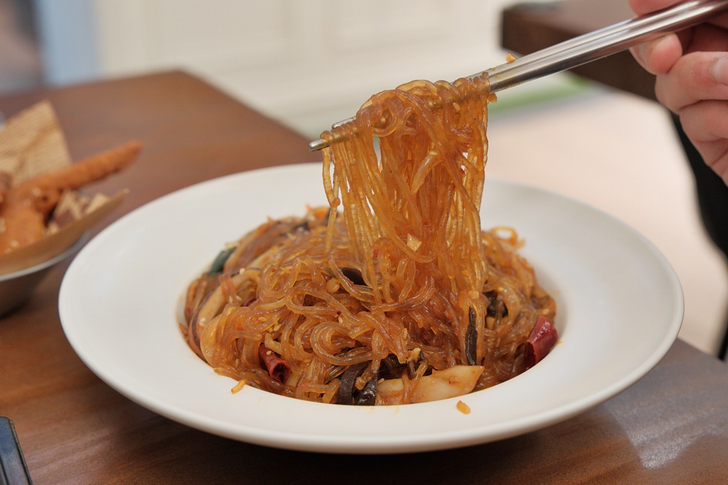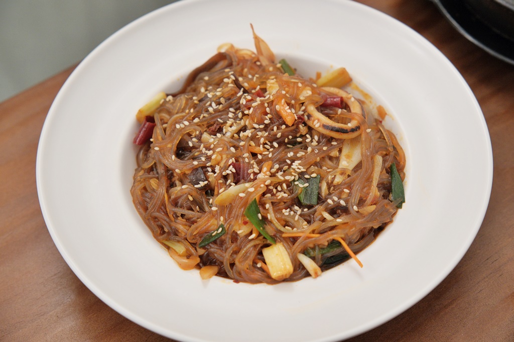 選用韓國粉絲加入海鮮配料一起拌炒至入味,口感十分 Q 彈!