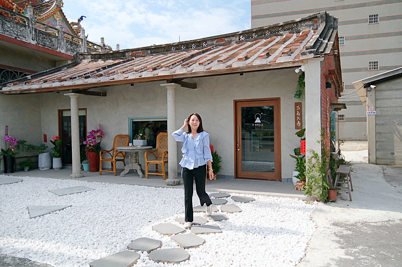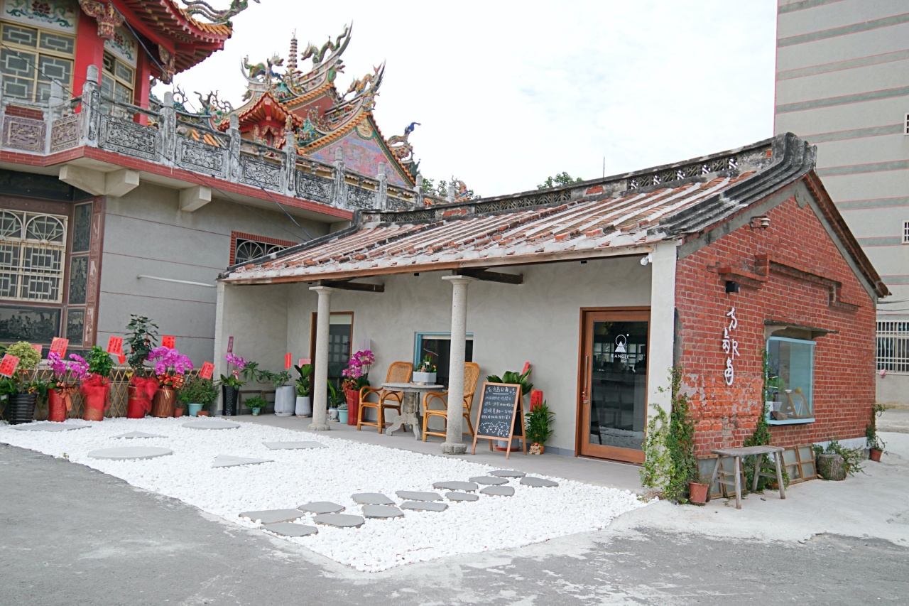 才開幕兩週的「方島R角甜點工作室」是一棟老屋改造,就開在子茂南天宮的旁邊,完全就是神明掛保證推薦的咖啡館啊(笑)。保留著阿嬤年代的紅磚瓦,門口的藤椅、長板凳,是一間復古又具有文創氛圍的廟宇咖啡館。