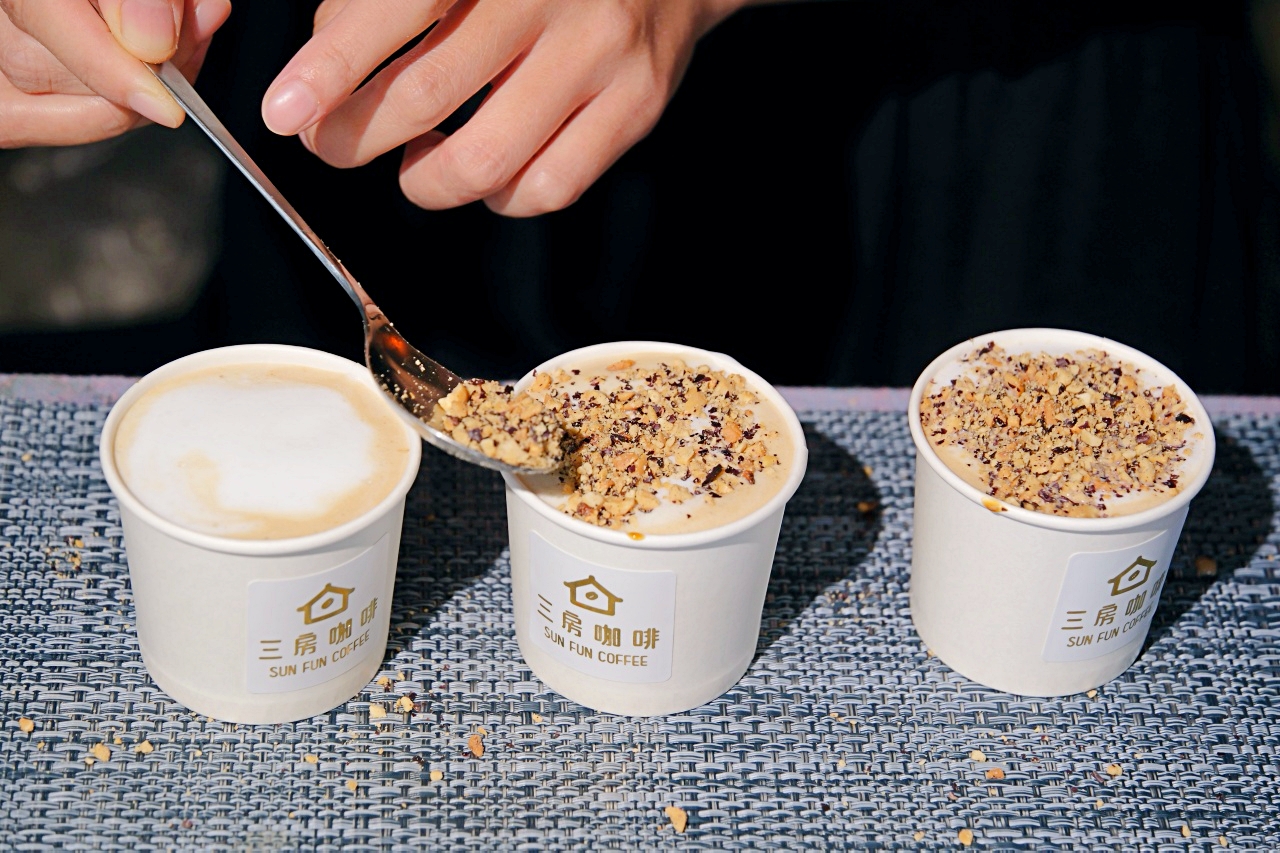 這次為了11/25即將開跑的雲林花生季,三房咖啡特地推出用在地種植的黑金剛花生碎來製作花生拿鐵,有著濃厚的花生香氣,配上咖啡和奶香,把傳統的農作物搖身一變成為時尚飲品,不只兼具創意口味上也不錯唷。