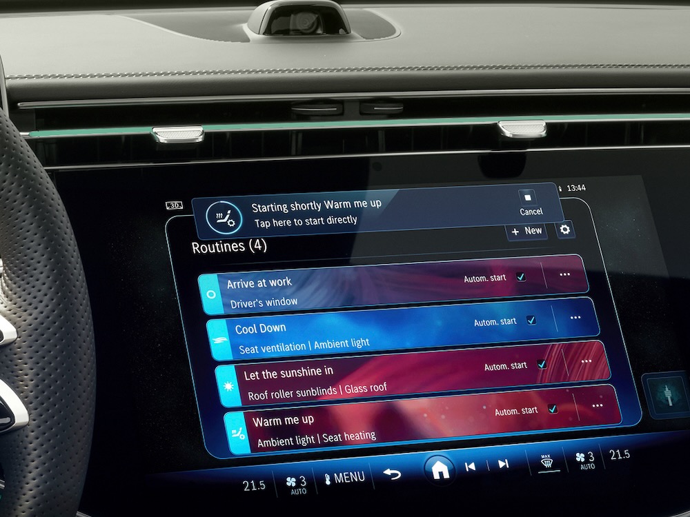 全新 E-Class 導入全新世代的 MBUX 車載系統,以三芒星先進的數位豪華,提供強大的處理核心,使數位體驗更加流暢。並結合 AI 人工智慧,語音助理能辨識更多自然語言的操作指令,也能在指定條件下啟用 “Just Talk” 功能,直接與語音助理對話。更加無微不至的是 MBUX 能了解乘客使用習慣或車主自行設定,透過“Routines”這項功能達成自動化的目標。此功能是以特定條件達成時,系統自動執行相對應的車輛設定,比如在平日早上 8 點從住家出發後,會建議開啟廣播電台,在上班的路上收聽新聞資訊。或是冬天天氣低於18度時將自動開啟座椅加熱功能。全新 MBUX 為照顧乘客的乘車舒適及安全,優化使用介面及增加貼心功能,如 ”ENERGIZING COMFORT” 新增了多種模式,以不同車室聲光及動畫的設定,幫助乘客於疲勞時提振精神,壓力升高時放鬆身心。