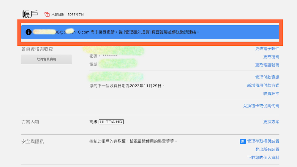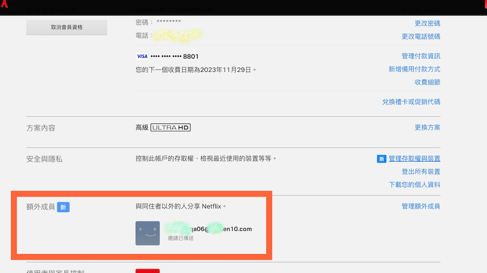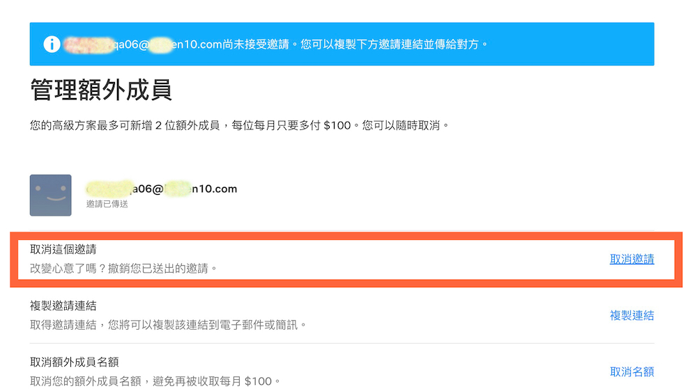 2、同樣在剛剛的帳戶頁面,如果有看到上方出現有不知名信箱竟然受邀成為自己的額外成員,這時就能往下滑,在下方看到「額外成員」後該陌生信箱的資料,接著選擇旁邊的「管理額外成員」,在裡面取消邀請。並且於「取消名額」中確認取消動作來避免接下來每個月要付 100 元的額外金額!