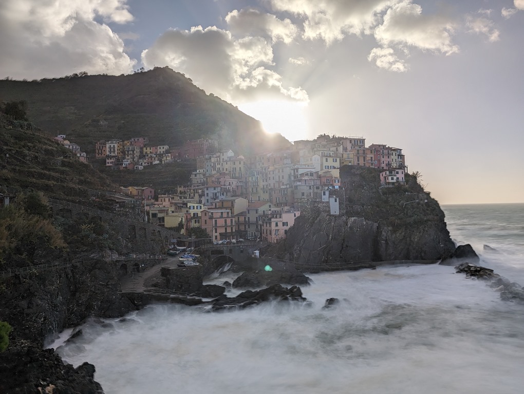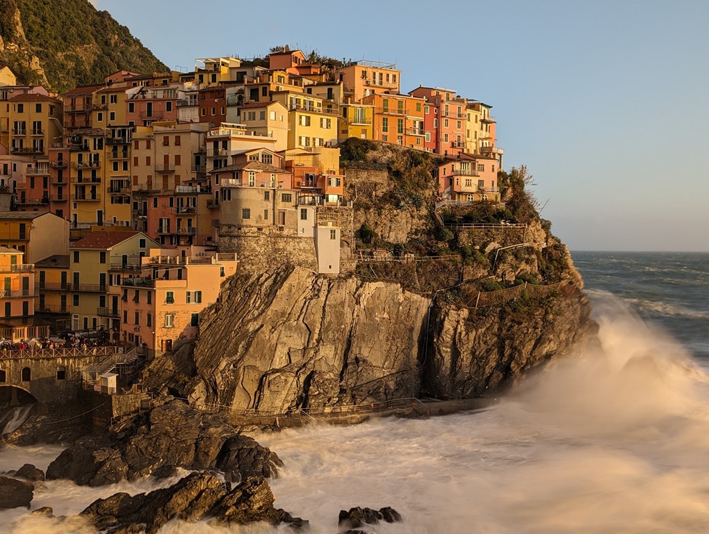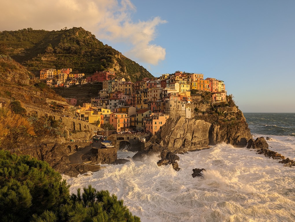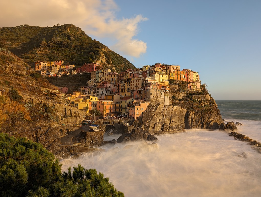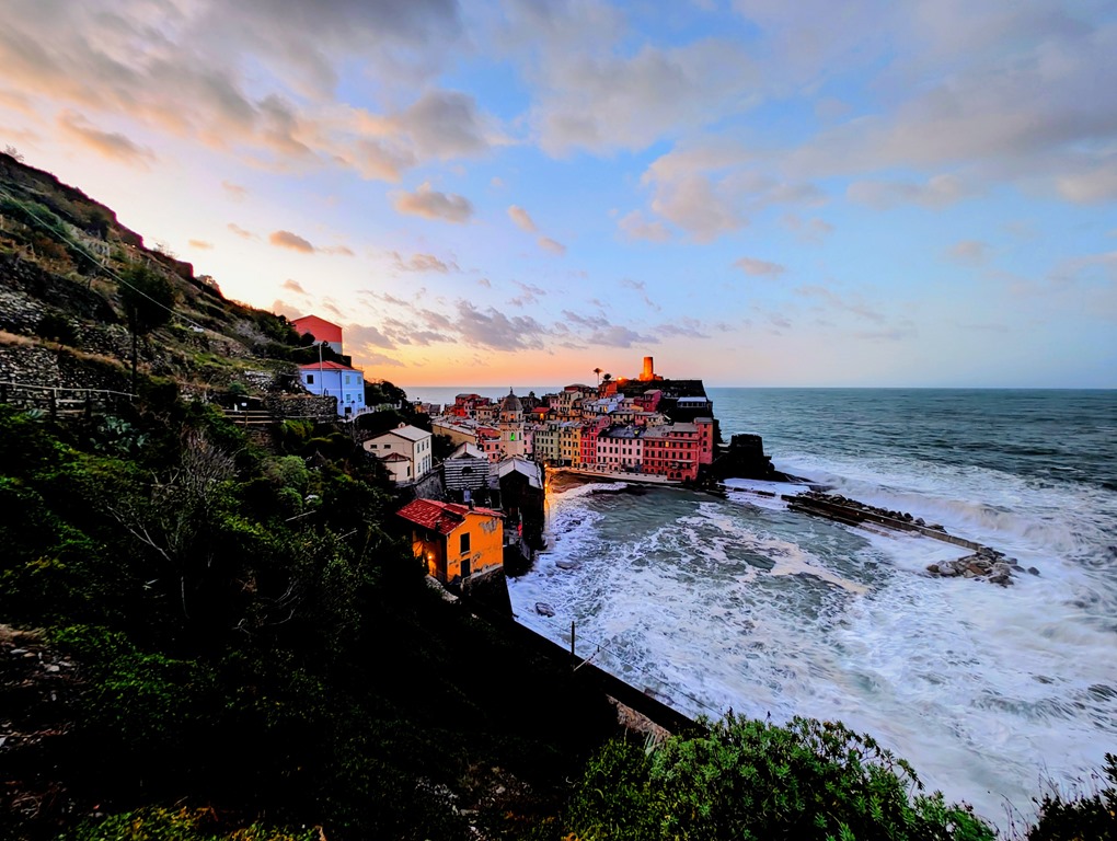 幾乎所有來五漁村的觀光客,都不會錯過著 Manarola,畢竟這是五漁村最重要的地標,所以我來了兩次,第一次還是因為時差太早起床,就晃到這邊來,看到一大早就有攝影師在拍攝點等日出,所以我也跟去湊熱鬧。這邊如果要用文字形容,就是長在峭壁上的彩色房子。雖然天空基本已經亮了,但問拿著大相機的當地人後才知道,太陽等等會從山後冒出頭,會有漂亮的光線。這其實對於手機來說還滿挑戰的,因為拍下來後一定要進行後製,不然前面彩色房子就會暗暗的一片,所以就來考驗一下 Pixel 8 Pro 的拍攝能力與 Google 強大的 AI 後製能力好了。