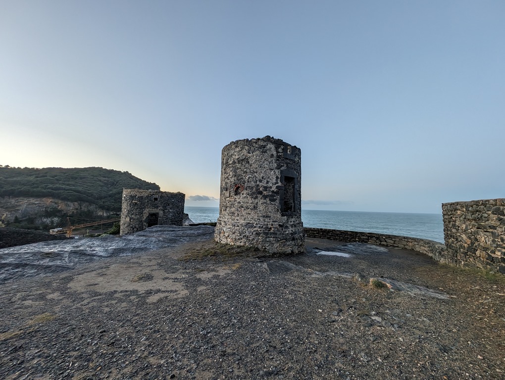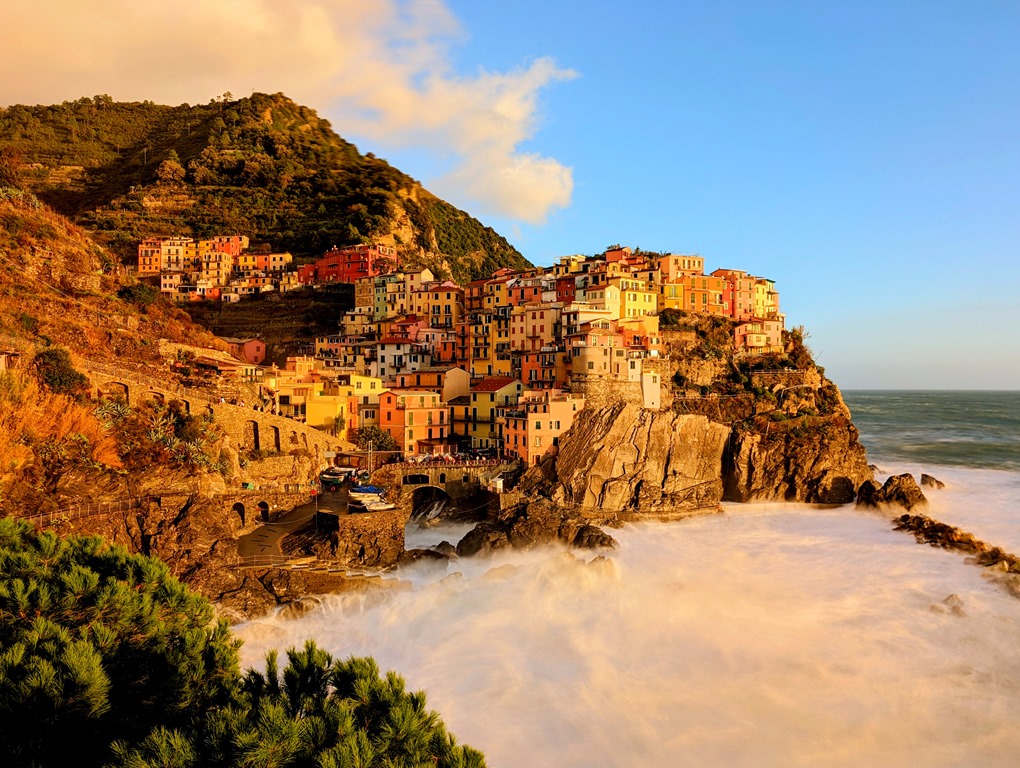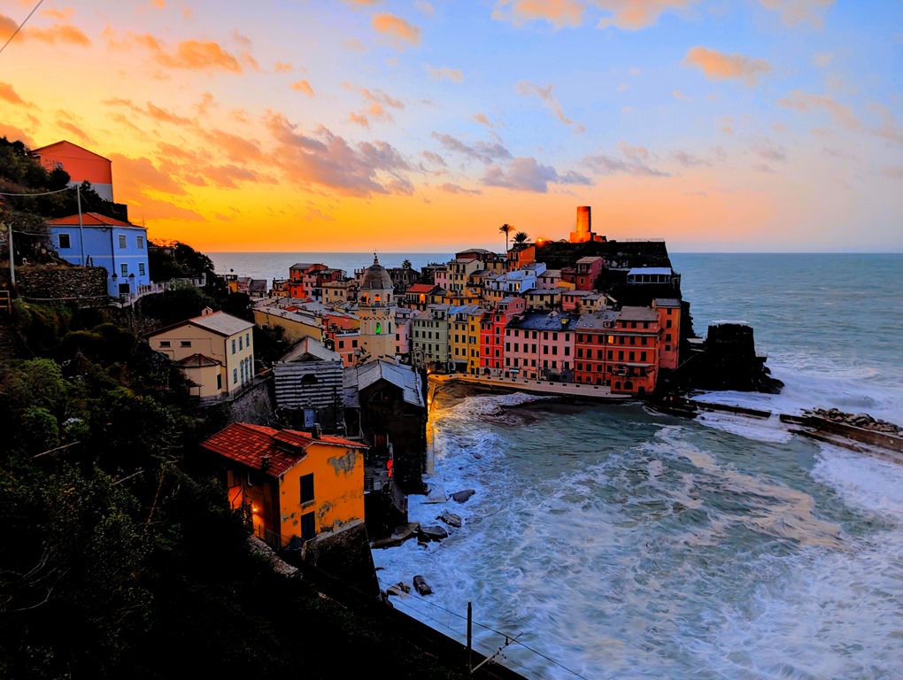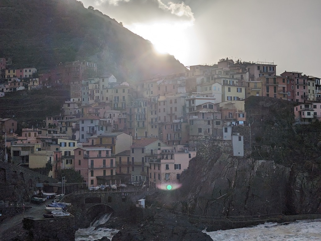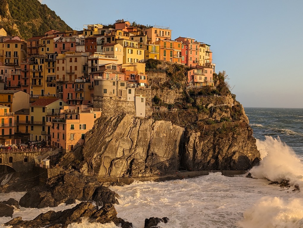 幾乎所有來五漁村的觀光客,都不會錯過著 Manarola,畢竟這是五漁村最重要的地標,所以我來了兩次,第一次還是因為時差太早起床,就晃到這邊來,看到一大早就有攝影師在拍攝點等日出,所以我也跟去湊熱鬧。這邊如果要用文字形容,就是長在峭壁上的彩色房子。雖然天空基本已經亮了,但問拿著大相機的當地人後才知道,太陽等等會從山後冒出頭,會有漂亮的光線。這其實對於手機來說還滿挑戰的,因為拍下來後一定要進行後製,不然前面彩色房子就會暗暗的一片,所以就來考驗一下 Pixel 8 Pro 的拍攝能力與 Google 強大的 AI 後製能力好了。