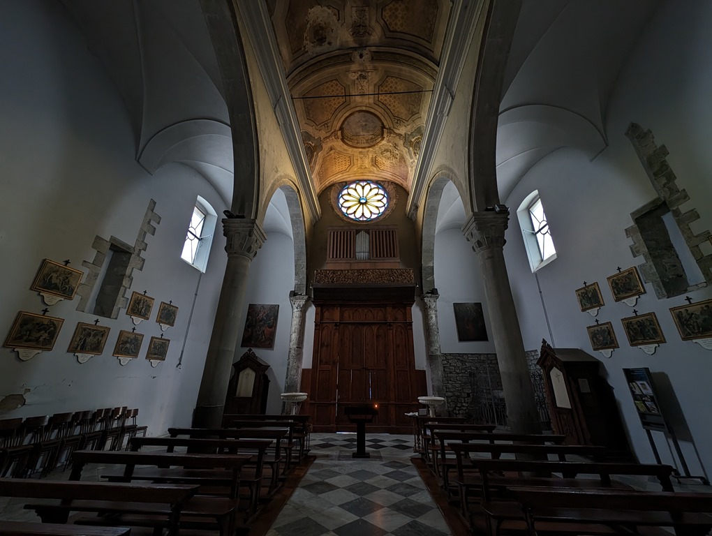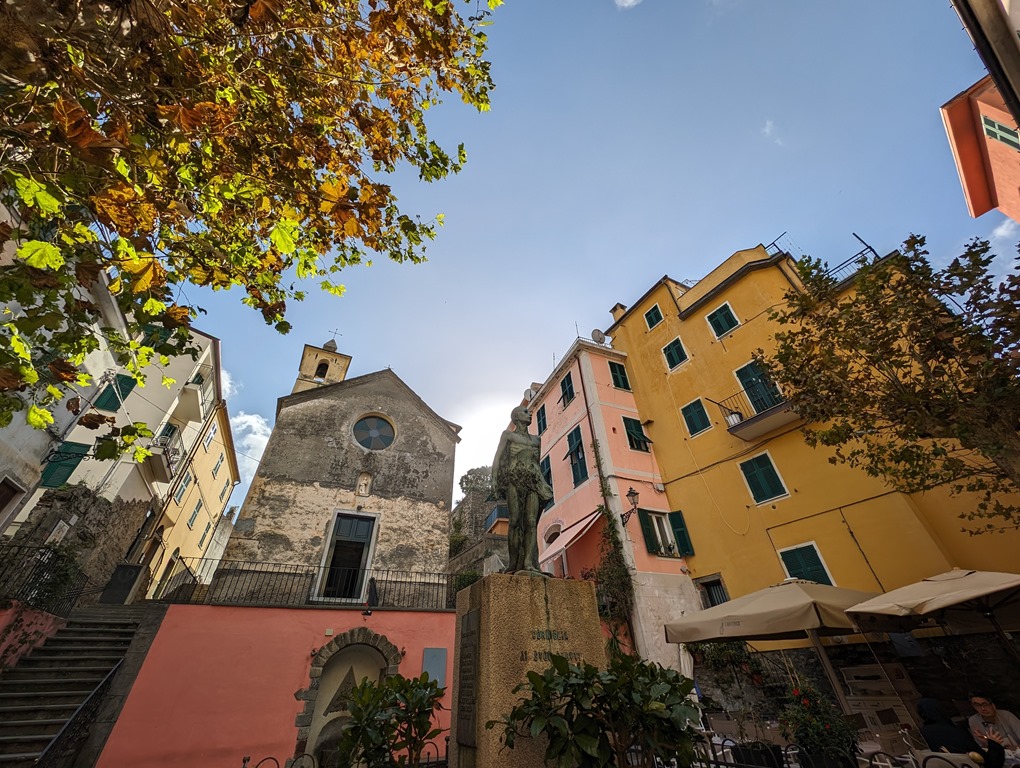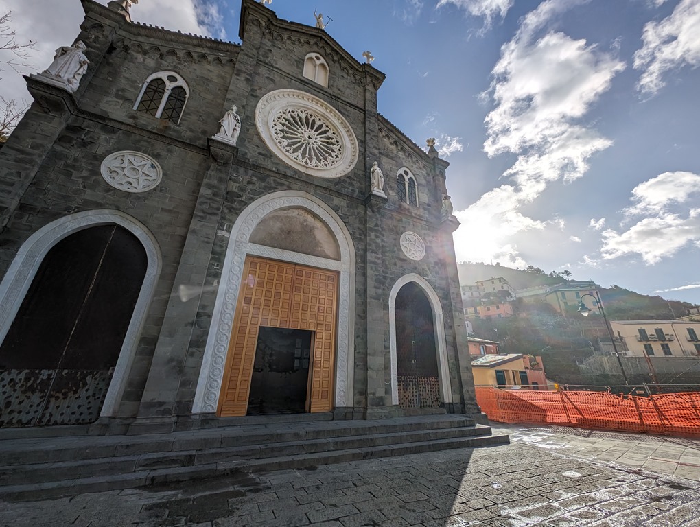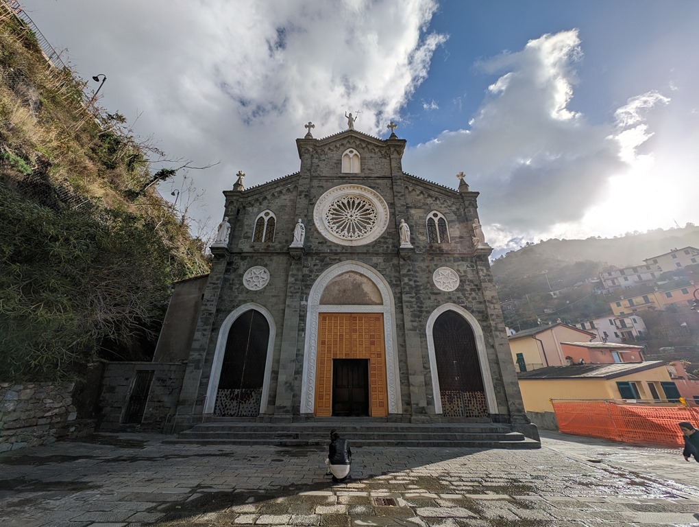 Chiesa di Santa Margherita 教堂也值得進去走走,反正都免費,不過我要說的是,教堂後面的有條小徑通往 Monterosso,從上面往下拍也非常美麗,不過這次因為封閉沒有辦法走到最好的拍攝點,天色也偏暗,所以只好使用 Google 相簿修圖大法處理一下。