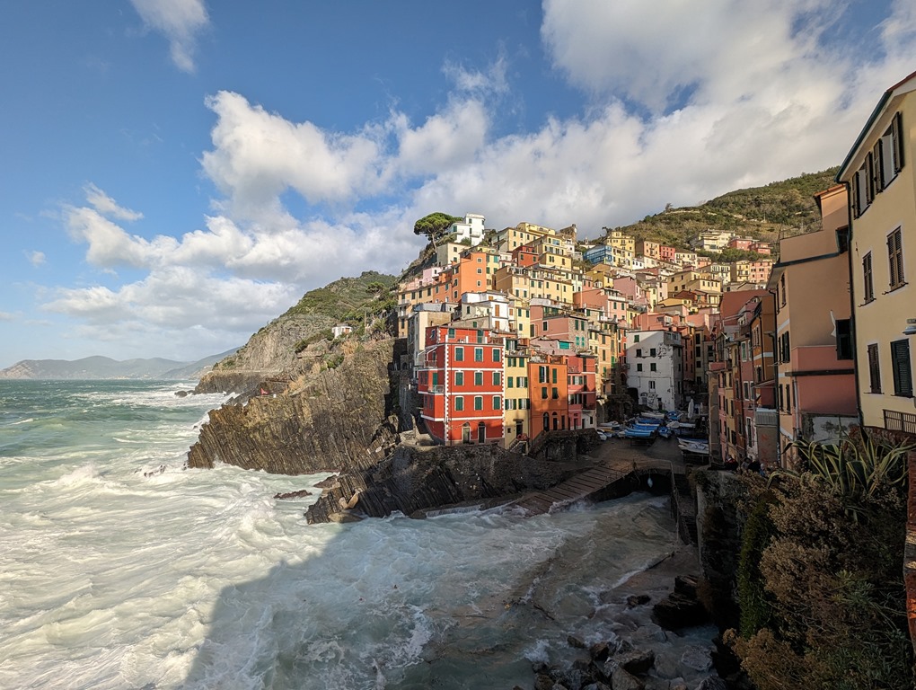 Riomaggiore 是五漁村中最值得花上幾小時走一圈的村落,面積不小,但到處都是美景。當然,這邊的海灘一定要來拍一張,但同樣的浪太大,所以完全無法戲水,也不能太靠近海邊。海灘這排彩色屋適合上午接近中午時拍攝,光線剛好會灑在房屋上。