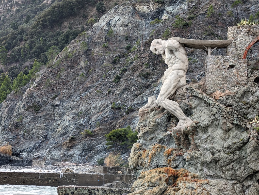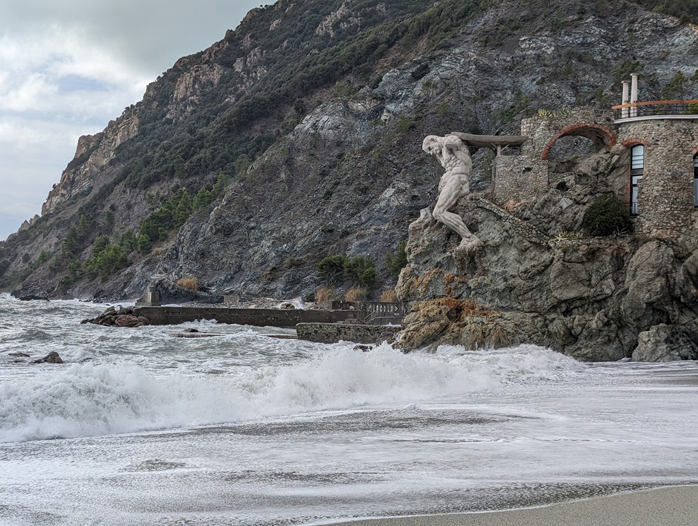 Monterosso 在夏季時是非常著名的海灘聖地,但在入秋冬後,海灘上都是大浪,連在沙灘走的機會都沒有,不過往最裡面走去還是可以看到著名的地標 Statua del Gigante 巨人雕像。