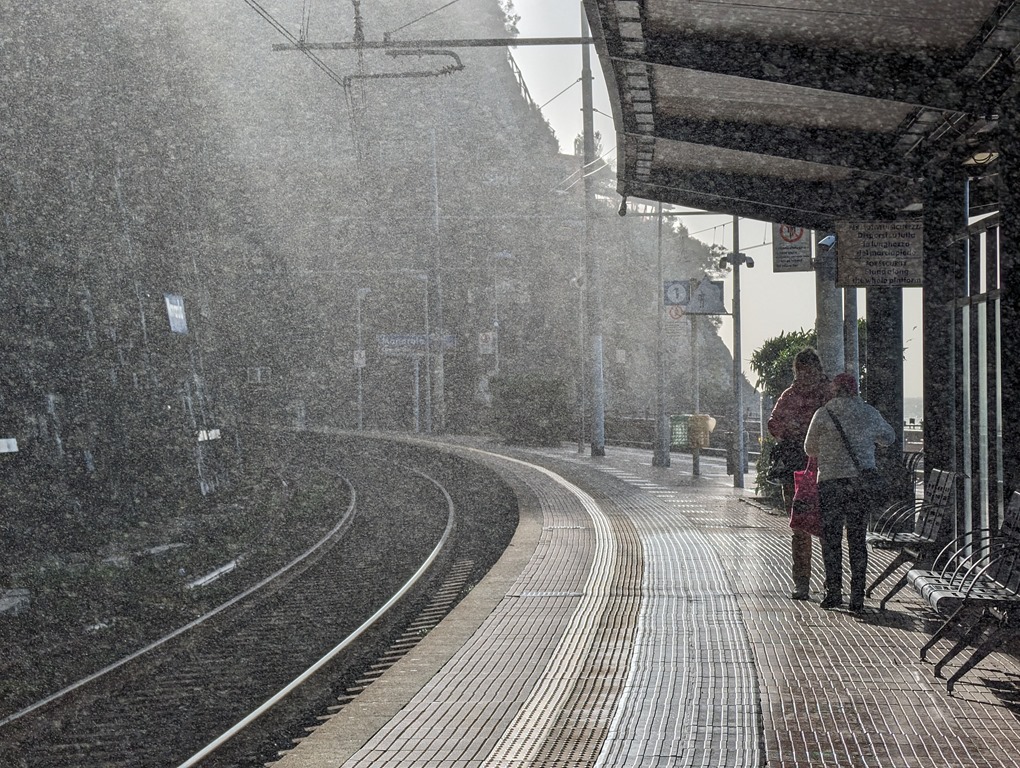 在這次旅途中,海浪打在岸上的浪花都飄到車站,也讓等車時看到煙霧瀰漫的風景,是這季節獨有的美景。