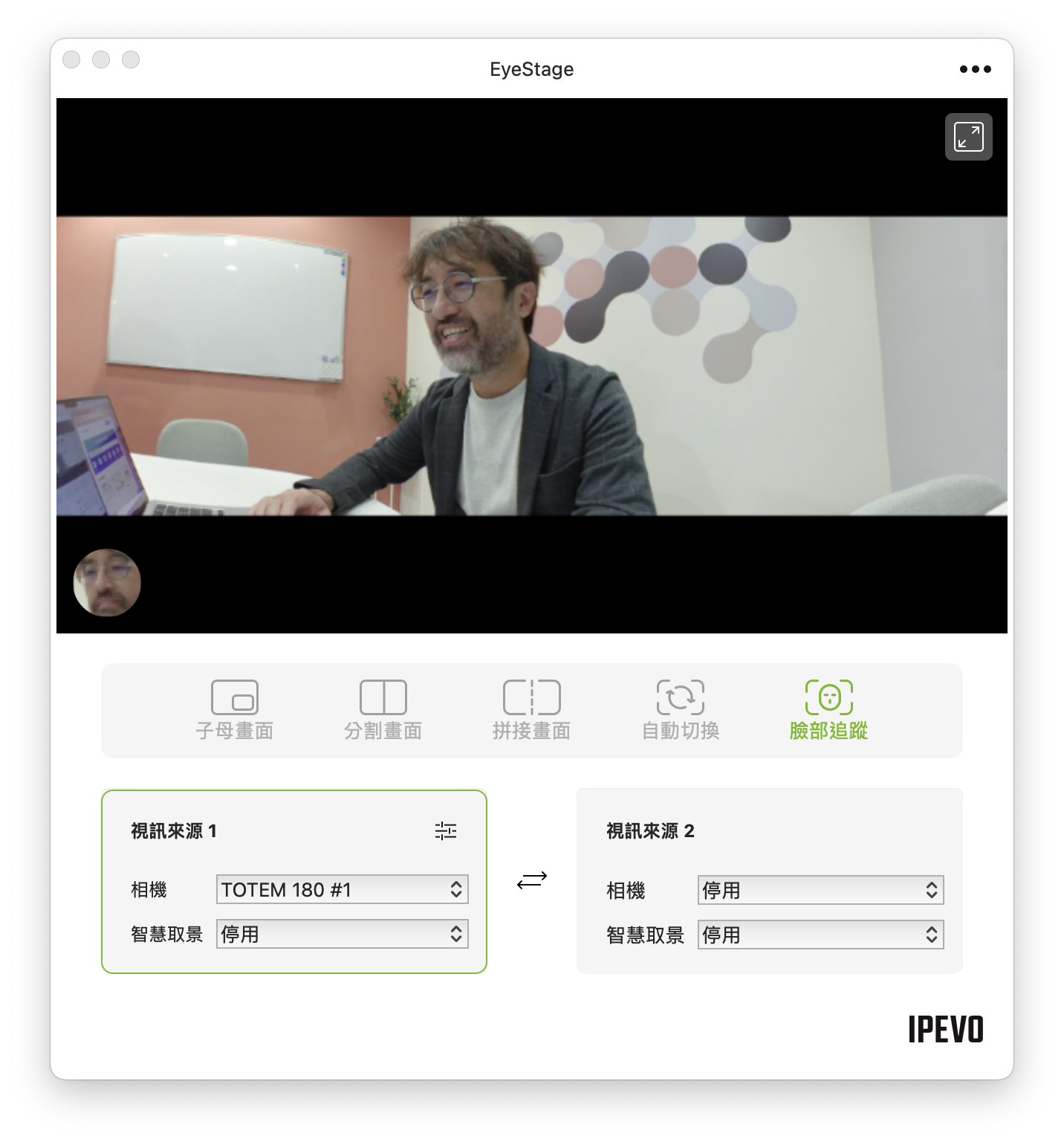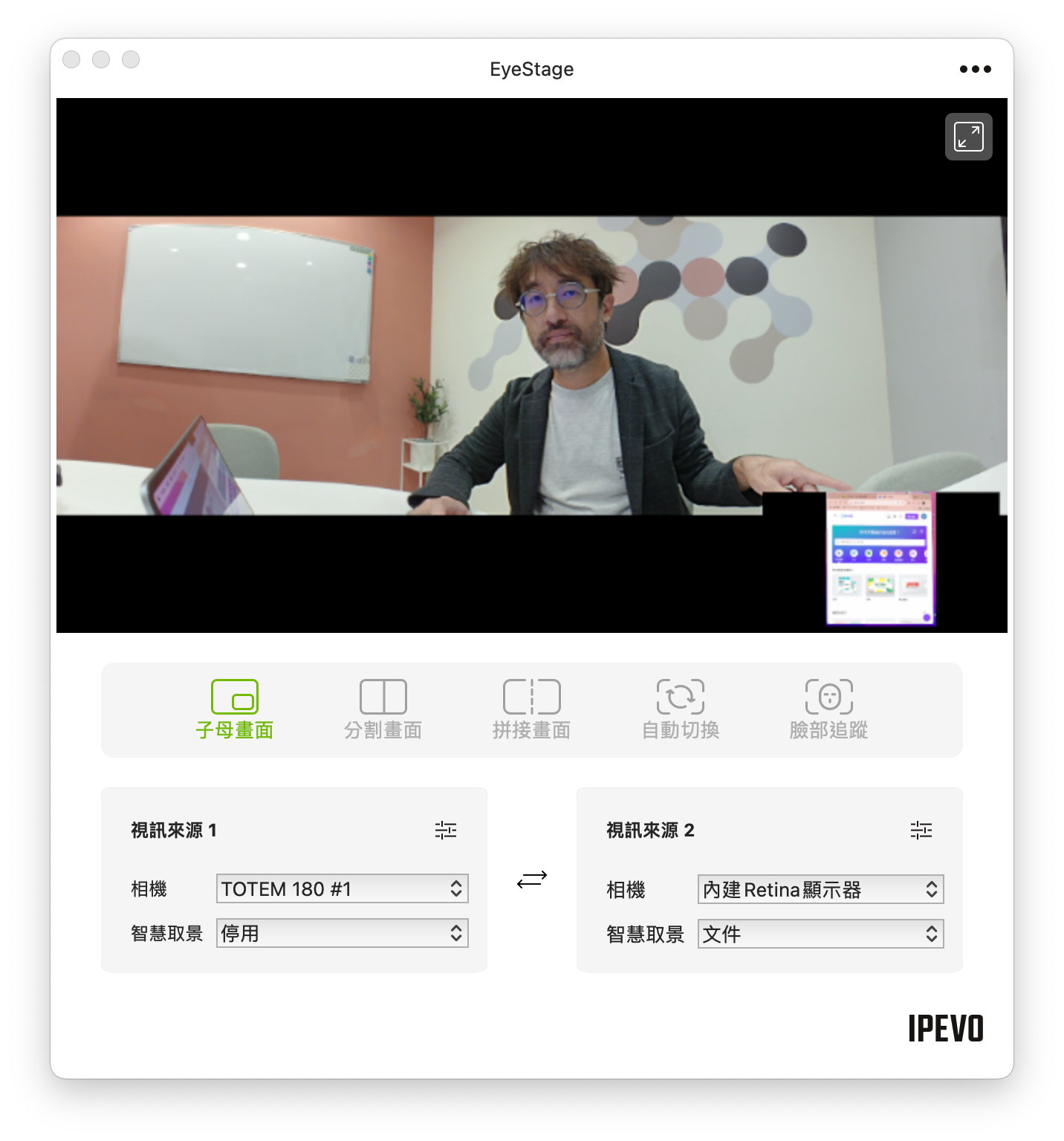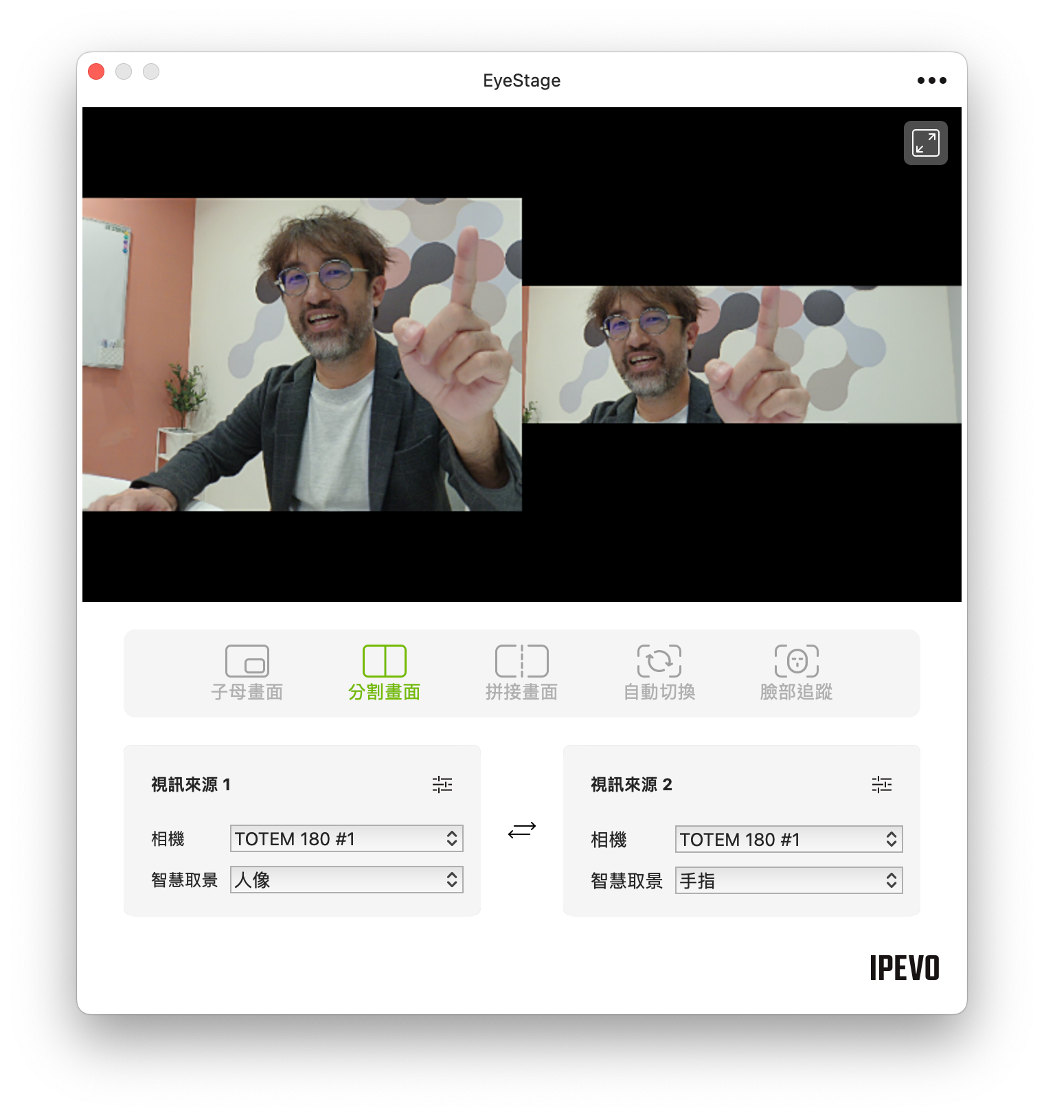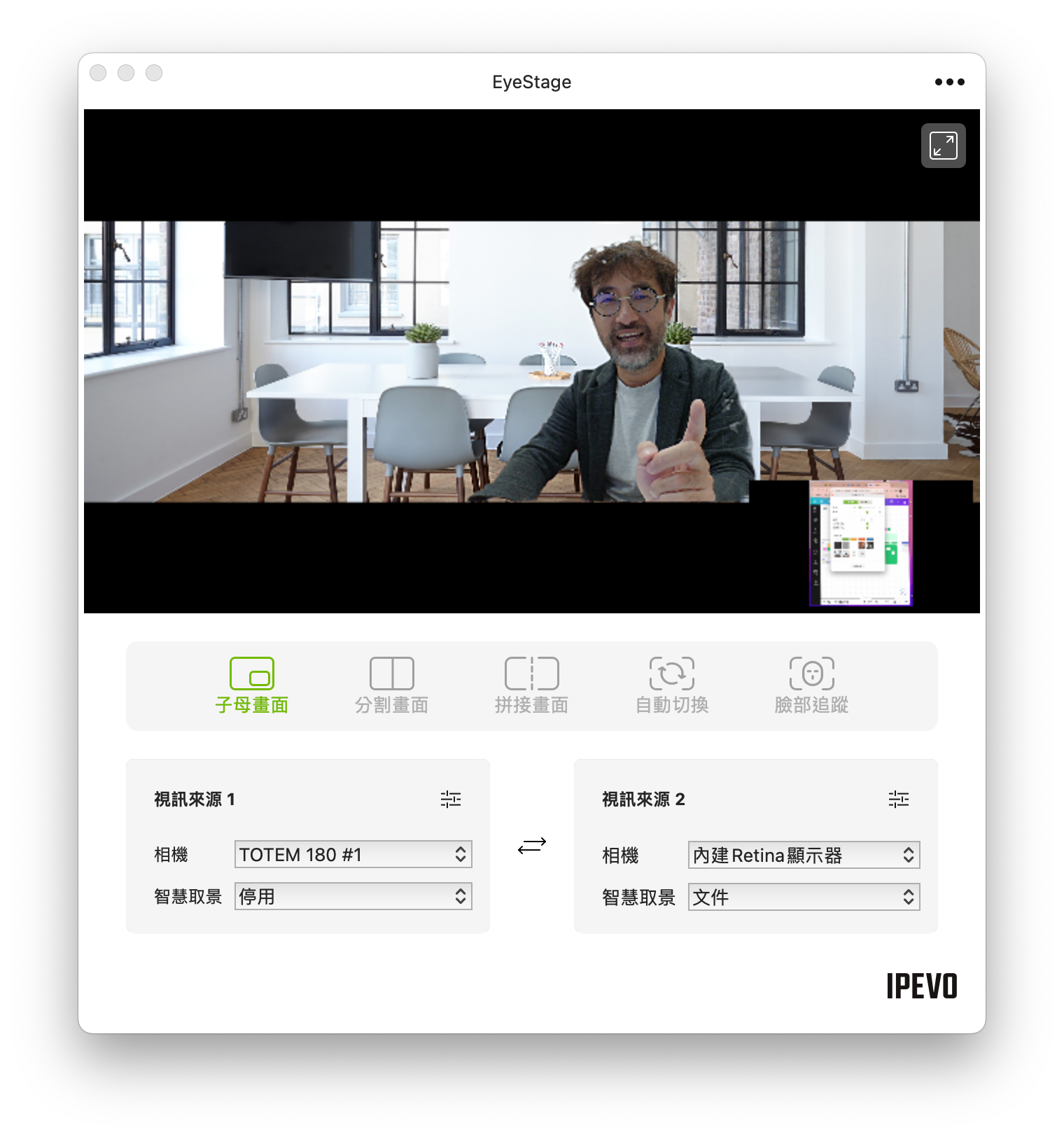 若是搭配 IPEVO 開發的 Eyestage 軟體的話,還可以使用多種模式切換,像是子母畫面、分割畫面、拼接畫面、自動切換或是臉部追蹤等。