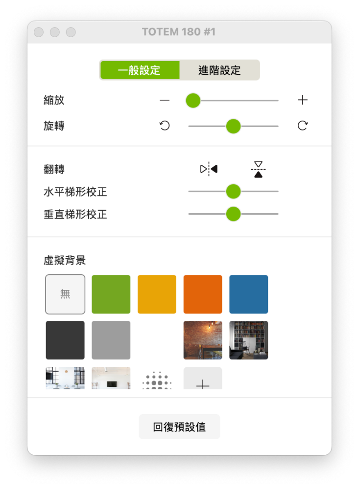 在內建的設定中可以選擇視訊縮放的角度、旋轉方向,或是當不想要曝光環境(例如在自己尚未整理的房間需要面試的話),就可以使用內建的虛擬背景功能,可以選擇將背景散景,或是直接套用一個虛擬畫面上去,彷彿身在另外一個空間。
