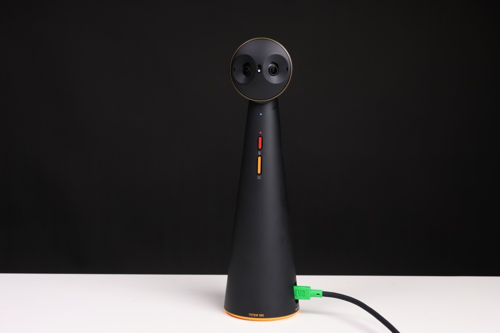 一般視訊鏡頭取景角度通常落在 100 度左右,有些主打廣角的視訊鏡頭可能會配備 120 度視角的鏡頭,但 TOTEM 180 全景視訊會議鏡頭最厲害的一點就是,可以透過兩顆 400 萬畫素的廣角鏡頭同時拍攝並自動接合畫面,讓畫面呈現 180 度的超廣角,這對於多人同時會議,或像是一般公司規模的會議室,就可以使用 180 度的全景視野模式,讓所有與會者都可以入鏡。