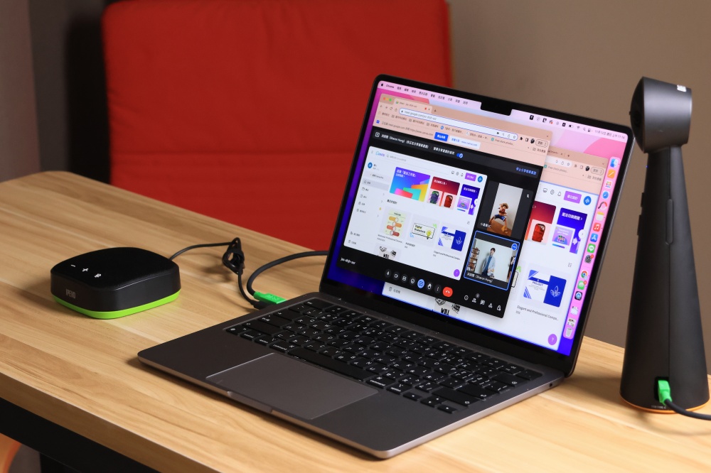 音效方面,由於 TOTEM 180 全景視訊會議鏡頭具備兩顆降噪麥克風,在一般環境下使用表現還不錯,但如果身處的環境比較嘈雜,或是說在比較大的空間的話,會推薦搭配 IPEVO VC-A10 便攜式會議麥克風揚聲器使用,進一步讓聲音效果也達到和畫面一樣的高品質。