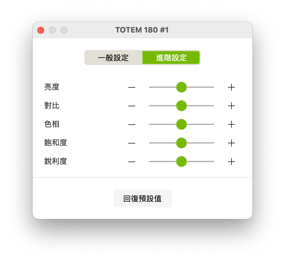 又或是身處的環境光線條件不是很理想的話,也可以透過進階設定裡的調整亮度、對比、色相、飽和度、銳利度來微調畫面表現,讓視訊畫面變得更好看。