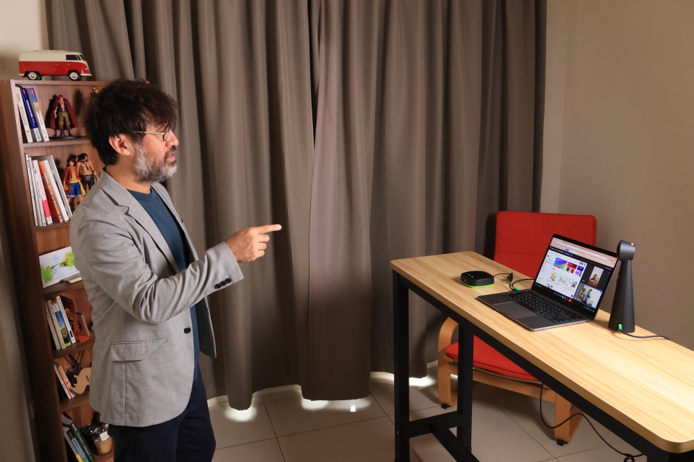 TOTEM 攝影機最大的優勢就是可以提供 180 度的超廣視角,如果與會的人比較多也不用擔心無法容納進畫面裡,雙鏡頭拼接技術也可以讓位處邊角的人畫面不變形,在進行重要會議時這樣的細節就很重要。除此之外筆者還滿常使用人像追蹤和背景模糊功能,人像追蹤我大多會應用在由我發言的時候,可以自然地在鏡頭前面走來走去,攝影機會自動追蹤我的臉,讓觀眾看起來就像是實體會議般有互動,比較不會有距離感,背景模糊則是用在有時候臨時需要約個視訊會議,但所處環境的背景不方便曝光時就非常好用。