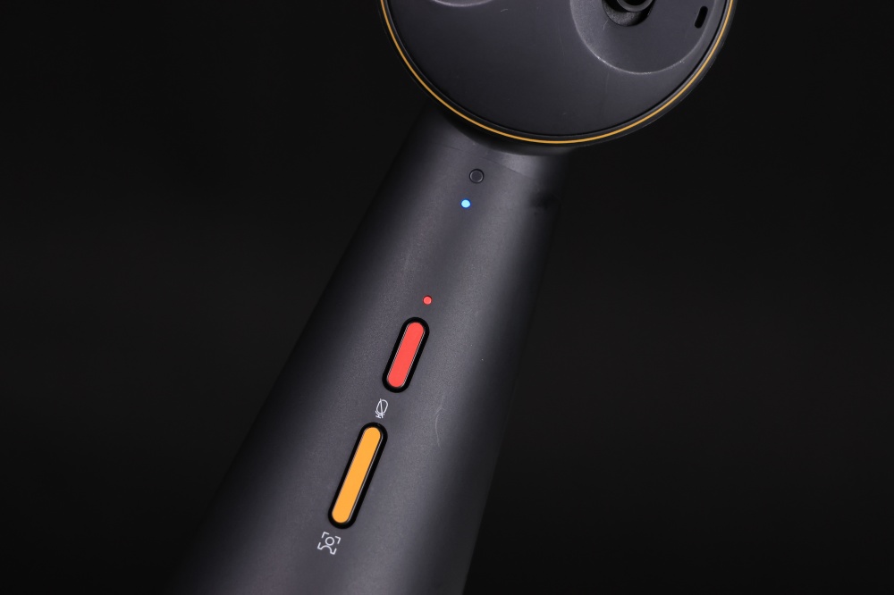 機身上有兩顆按鍵,顯眼的紅色按鍵為靜音鈕,按下之後上方會亮紅燈,告訴使用者目前麥克風靜音;下方則有一顆黃色模式切換鈕,可以切換不同的取景模式;最上方的藍燈則是在連接到電腦,確認有供電後就會亮起。