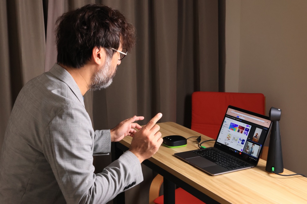 除此之外我們還發現,如果將智慧取景功能切換到手指的話, TOTEM 180 全景視訊會議鏡頭甚至可以跟隨「手指」的位置自動調整取景範圍,對於要展示或是引導觀眾觀看特定內容時就很好用。