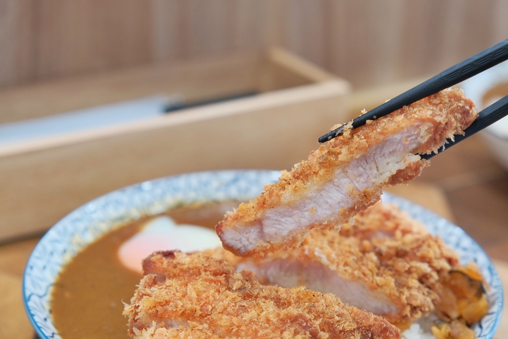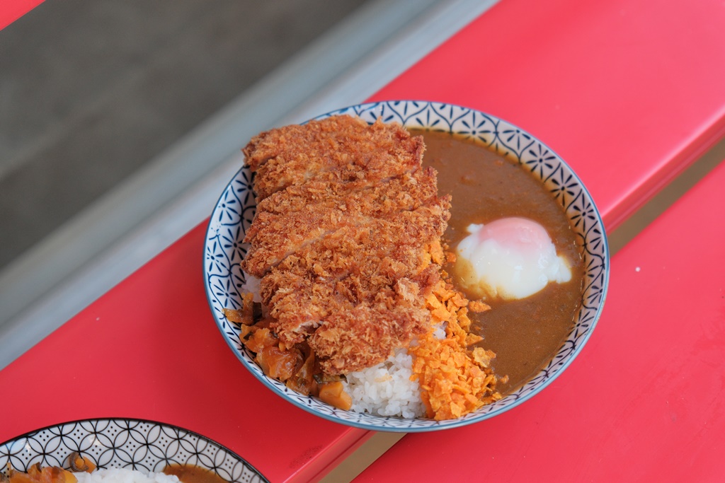 我原本想點乾咖哩或起司牛奶雞飯,但又突然被豬排給魅惑了豬排份量超多,每一塊都好厚,口感軟嫩不柴,表現蠻有水準,可惜口味偏鹹了點,不知道是醃的時候下手太重還是胡椒粉撒太多,吃個幾塊就覺得蠻負擔的…咖哩醬是使用蔬菜熬煮,並經過48小時的低溫熟成,香Q的米飯拌上濃郁的咖哩醬汁和半熟蛋,整體溫潤順口,我自己蠻喜歡多力多滋碎片,酥酥脆脆的增加層次感,有加分效果!