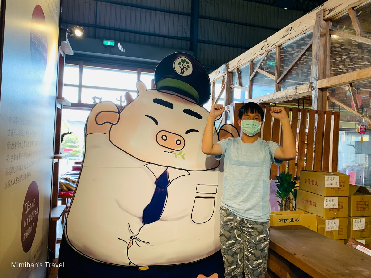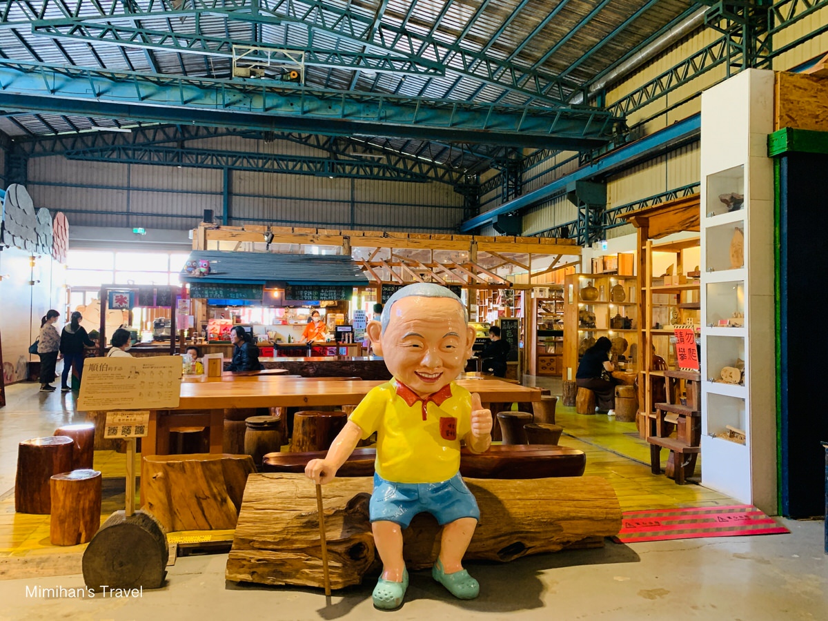 走到最後面是愛木村的用餐區,可愛的順伯公仔當然要合照一下啦!順伯正是順益木業、愛木村的創辦人,他手指比的不是讚,而是木業師傅表示木材尺寸的手語。