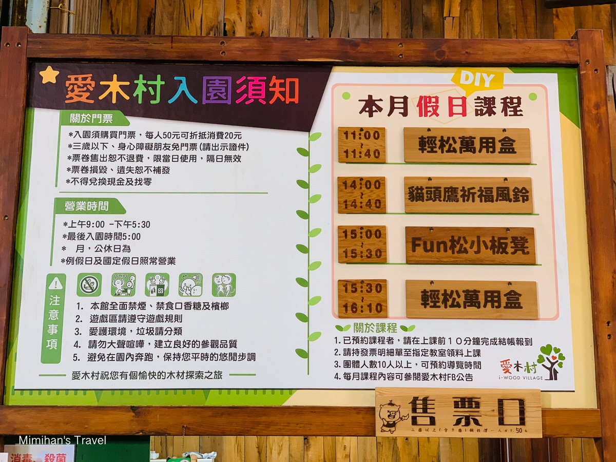愛木村門票是每人100元,每張門票可折抵50元館內消費。另外售票處也會列出當天的親子DIY活動,每月課程會提前在愛木村FB公告和接受預約,現場若有空位當然也是能直接體驗。
