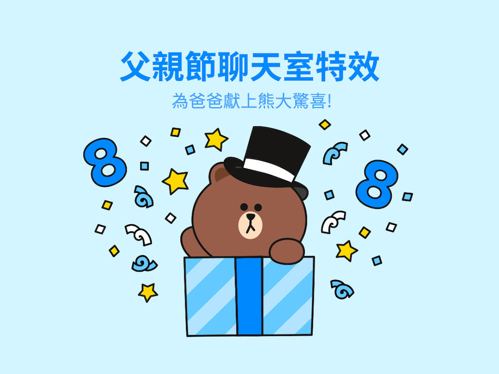 這些年來,LINE 每逢佳節都會開啟應景的限時聊天室特效,像是母親節、萬聖節,非常可愛療癒,相當受到台灣用戶的喜愛,唯獨缺少父親節特效。今年在LINE台灣團隊的努力下,首次開啟父親節聊天室特效,圖案中也放入了大家常說的「88」節字樣,讓全台爸爸都開心。