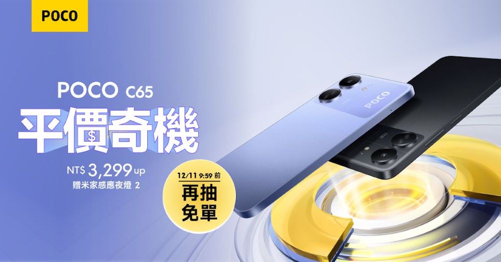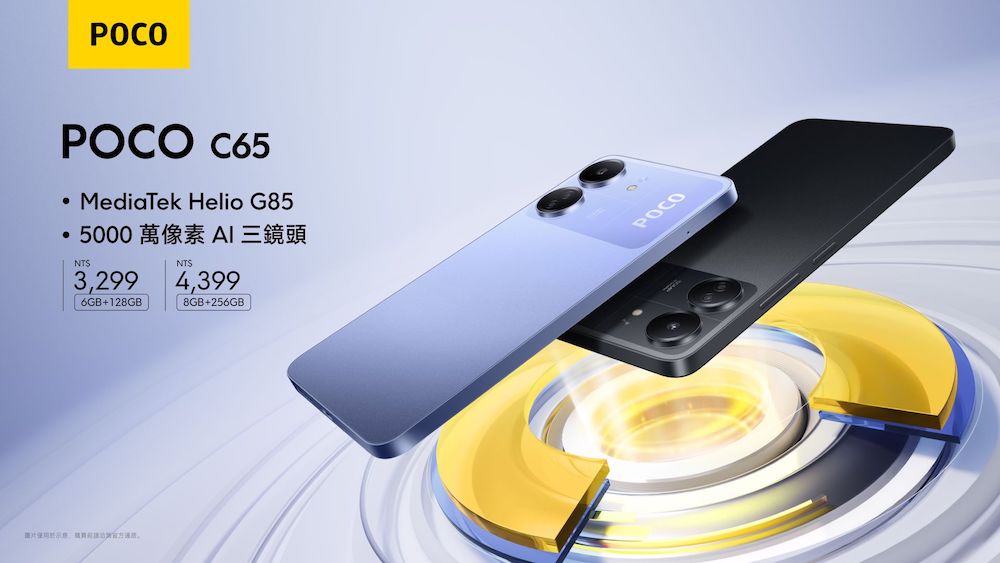 POCO C65 於 12 月 6 日起開放預購,6GB+128GB $3,299 元、8GB+256GB $4,499 元,共有紫色與黑色兩種顏色,12 月 11 日起全面開賣。