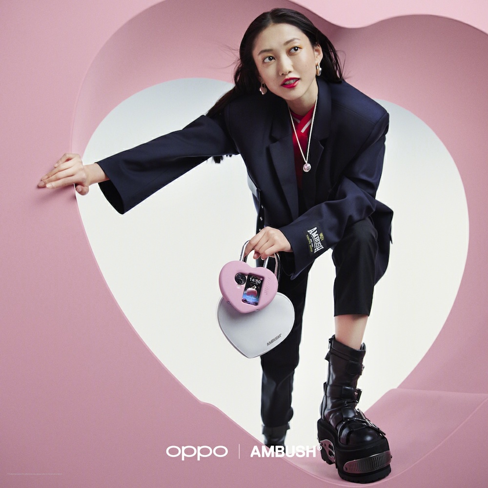 「OPPO x Ambush 摺疊手機殼」以Ambush 經典的心形標誌為特色,完美融合精巧的摺疊型態與潮流風格。