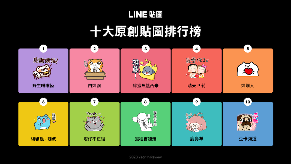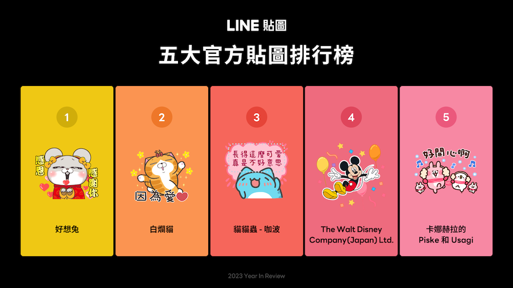 2023 年榜單曝光官方表情貼與原創表情貼排行榜,不論是官方還是原創表情貼前五名皆是動態,官方表情貼冠亞軍仍由「蠟筆小新」與「貓貓蟲-咖波」蟬聯。第三名「胖才可愛」首次以溫暖色調與療癒可愛風格進榜、第四名「好想兔」將實用文字巧妙融合讓聊天更到位。第五名來自日本人氣角色「反應過激的貓」則運用「陰影」技巧讓角色動起來更具3D立體感。