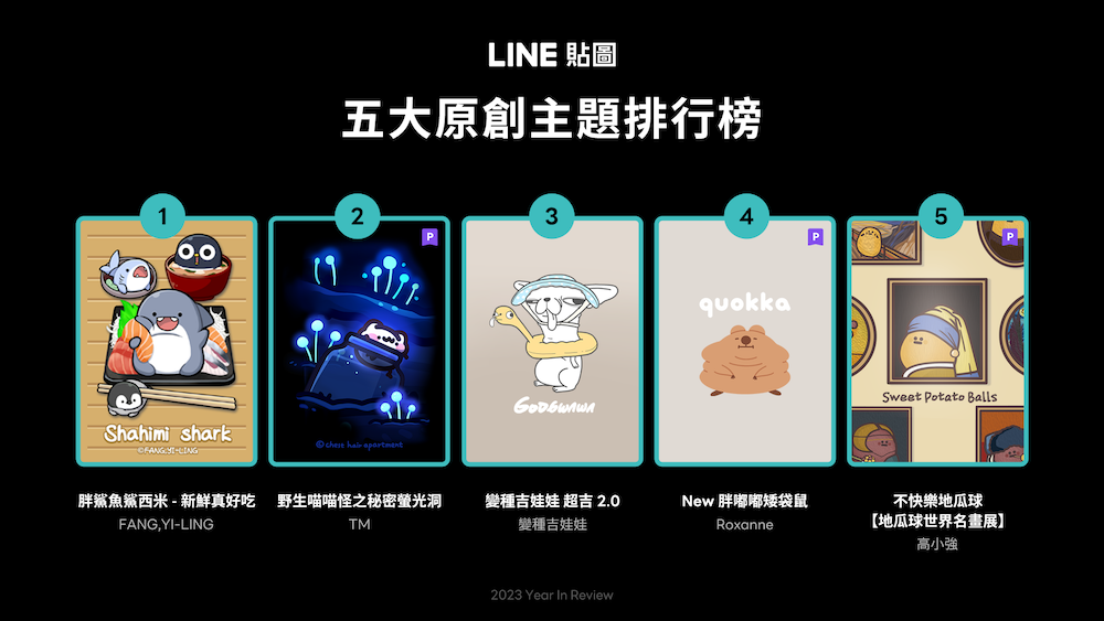 2023 年原創主題 Top5 持續展現豐富多變風格,「胖鯊魚鯊西米」與「變種吉娃娃」名次不變,穩居排行榜!原創主題亞軍「野生喵喵怪」則以夜晚為主題,搭配今年新增的「主題自動輪播」功能,淺色深色切換,讓聊天背景也能隨時間定時輪播。首次入榜的第四名「胖嘟嘟矮袋鼠」,以溫暖色系與可愛矮袋鼠療癒用戶的心、第五名「不快樂地瓜球」則配合「貼圖美術館」活動,將角色化作世界名畫的主角, 生動的演繹令人會心一笑。