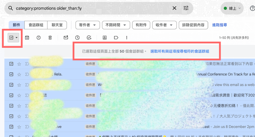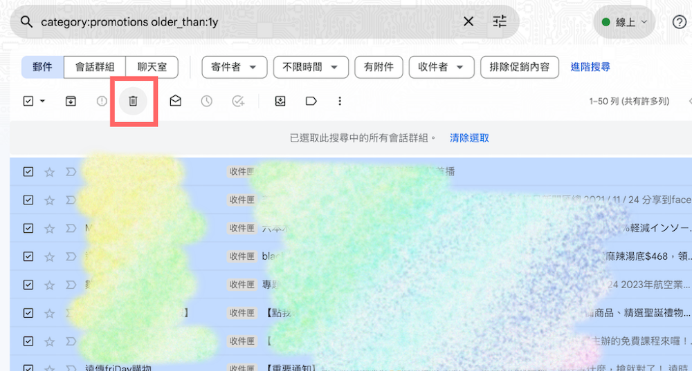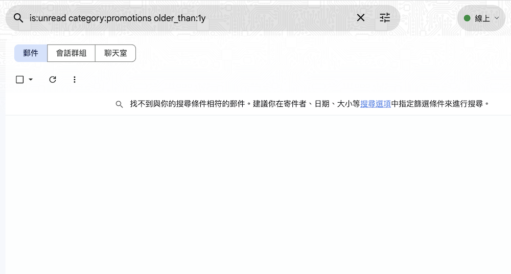 這時候我們把指令中的 is:unread 拿掉,只要留「category:promotions older_than:1y」來過濾。