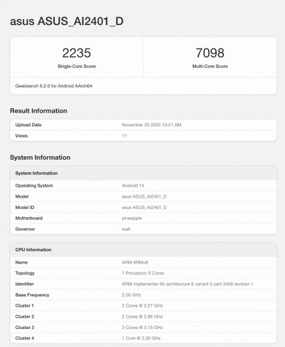除了 ROG Phone 8 的背景海報外,官方也預告過 ROG Phone 8 將會搭載高通 Snapdragon 8 Gen 3 行動平台,並在 GeekBench 跑分平台現身。GeekBench 中型號為 AI2401 的 ROG Phone 8 Ultimate 單核心成績為 2235 分、多核心成績為 7098 分。