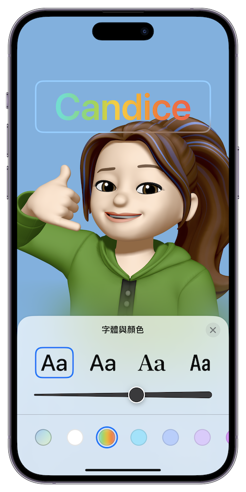 然後就能在「自訂」中來更換自己想要顯示的照片或是 Memoji 頭像與顯示的名字。而在 iOS 17.2 中,名字顯示的顏色加入了彩色的選擇。如果想要更換成彩色的名字,那麼同樣是在「自訂」中選擇自己想要更改顏色的海報,或是透過「+」新增一組。在輸入名字的地方點一下,就能夠更換字體與顏色,如果想要換成彩色的選項也是在這邊。