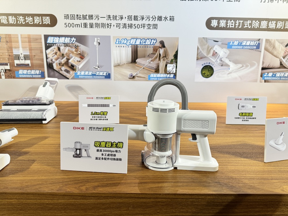 多樣大掃除情境!DIKE 淨速吸 All in One 即日起於嘖嘖募資平台開放預購,標配款(無線手持乾吃吸塵器、扁嘴、軟管、毛刷配件)早鳥價 NT$3,490 元,加入專業拍打式除塵蟎刷頭的全配款早鳥價 NT$3,990 元,再加上專業電動洗地刷頭的旗艦款早鳥價為 NT$5,990 元。