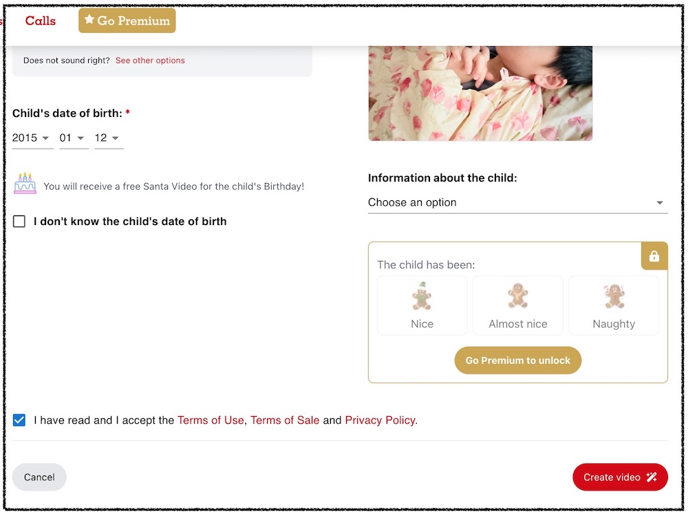 步驟 2、輸入小孩的名字、生日與照片後,還能在 「Information about the child」中選擇想要讚美小孩的特點後就能進入「Create video」。