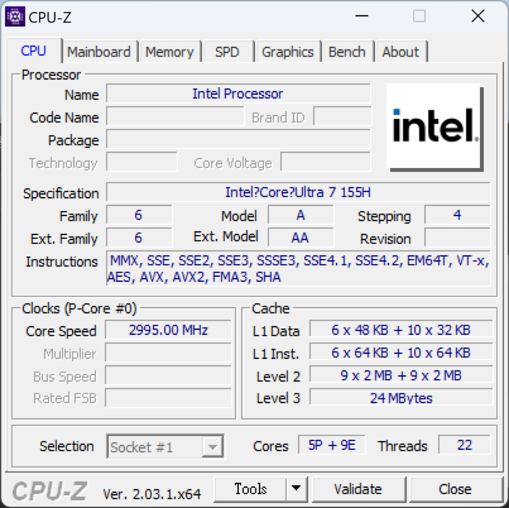 使用 CPU-Z 交叉查看處理器,一樣顯示為 Intel® Core™ Ultra 7 155H,擁有 16 核心 22 執行緒,基礎時脈為 3.80 GHz,最高時脈可達 4.80 GHz,並擁有 24 MB L3 快取記憶體。