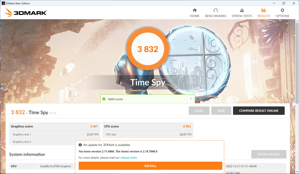3DMark Time Spy 測試得到 3,832 分。