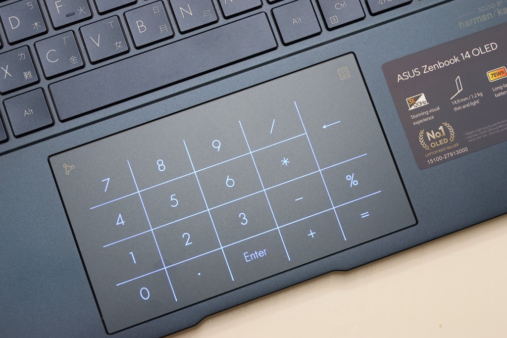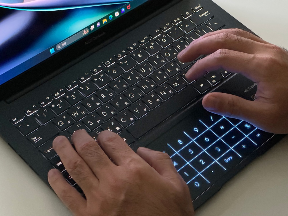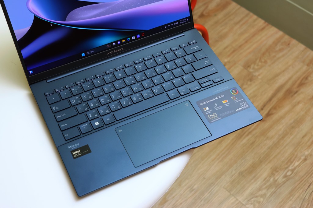 以輕薄筆電來說 Zenbook 14 OLED 鍵程深度足夠,1.4mm 鍵程打字輸入時的回饋手感還滿不錯的,而且底下的觸控板面積也夠大,操作起來很順手。