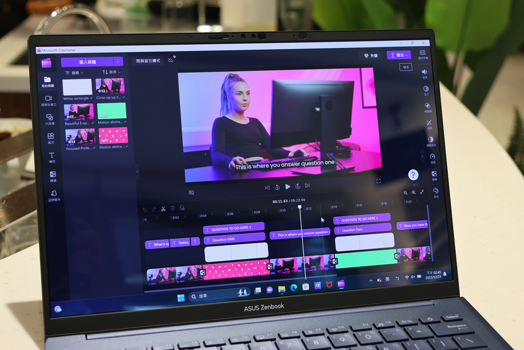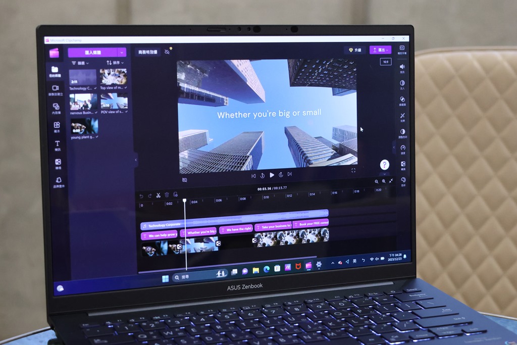 另外像是剪輯軟體 Adobe Premiere Pro,在新的 Intel® Core™ Ultra 7 155H 驅動下,效能提升,在剪輯時更為流暢,輸出也更有效率,如果想要體驗 AI PC 在影像創作上的輔助的話,也可以使用 Windows 內建的 Clipchamp 來體驗 AI 影像生成的威力。